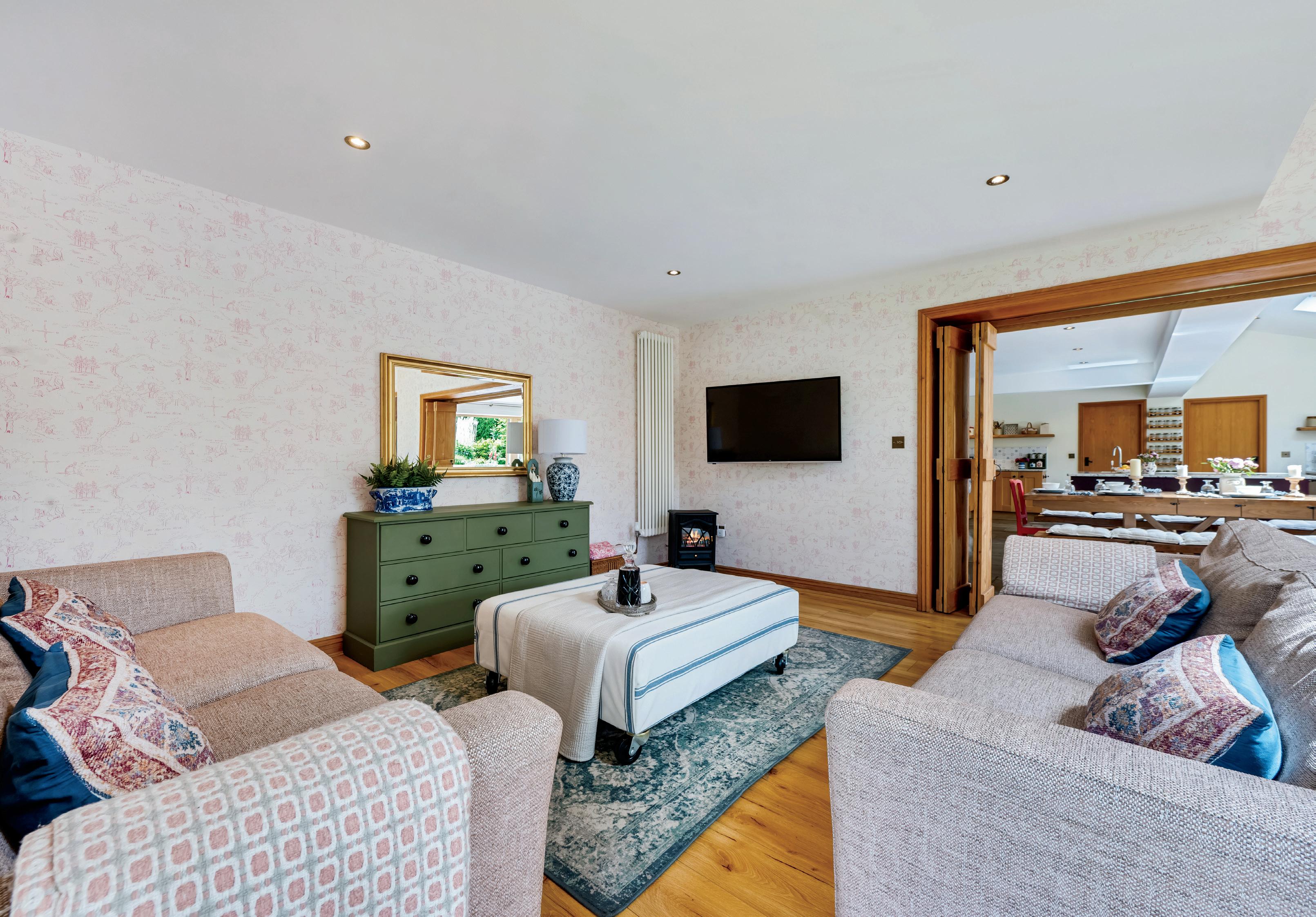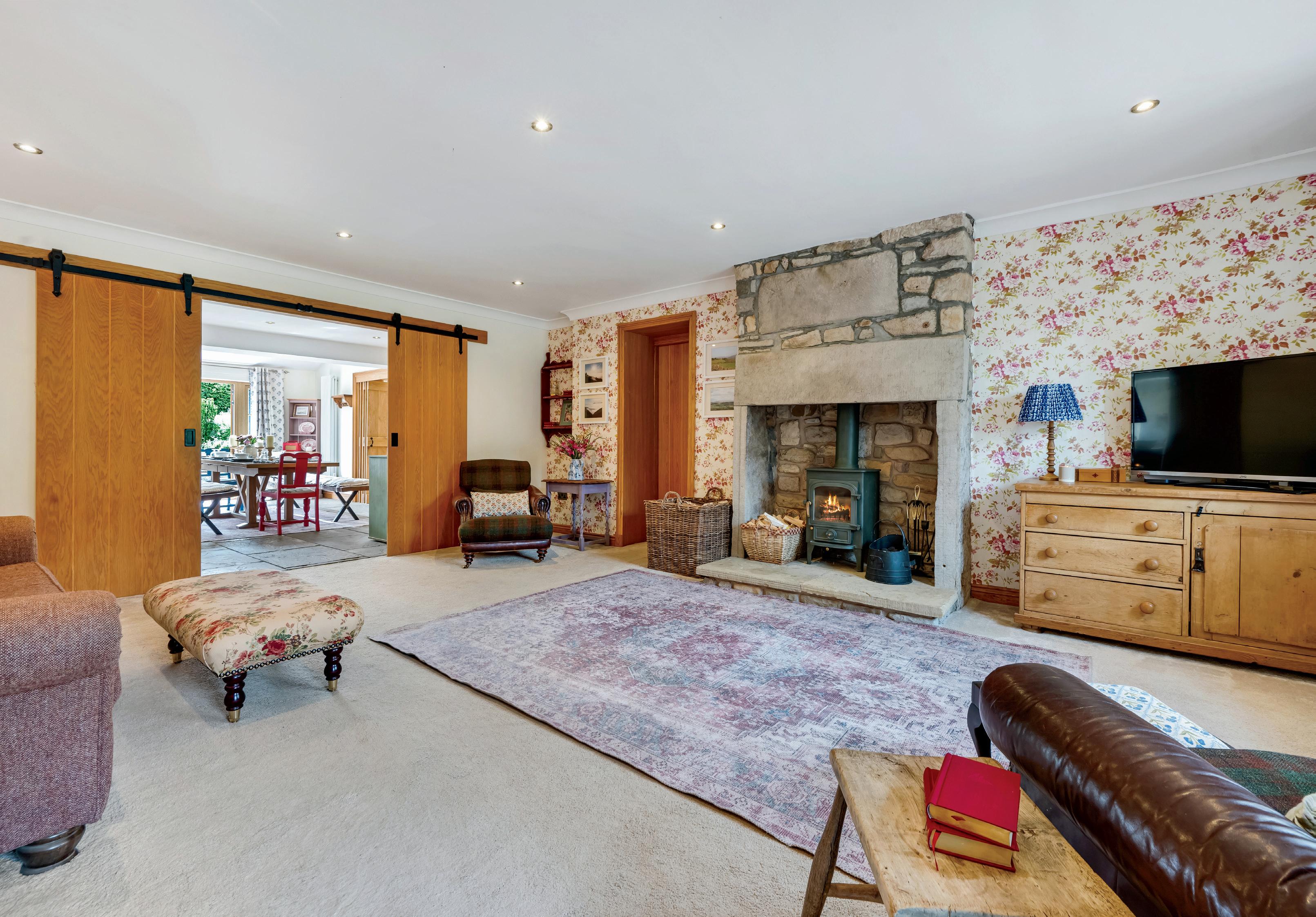 The main living room offers warmth and elegance, centred around an exposed stone fireplace and log-burning stove. Adjoining is a versatile study or snug, with French doors leading outside -ideal as a home office, library, or garden room. A separate family room provides additional space for entertaining or retreat, featuring full-height glazing and vaulted ceilings that flood the room with natural light.