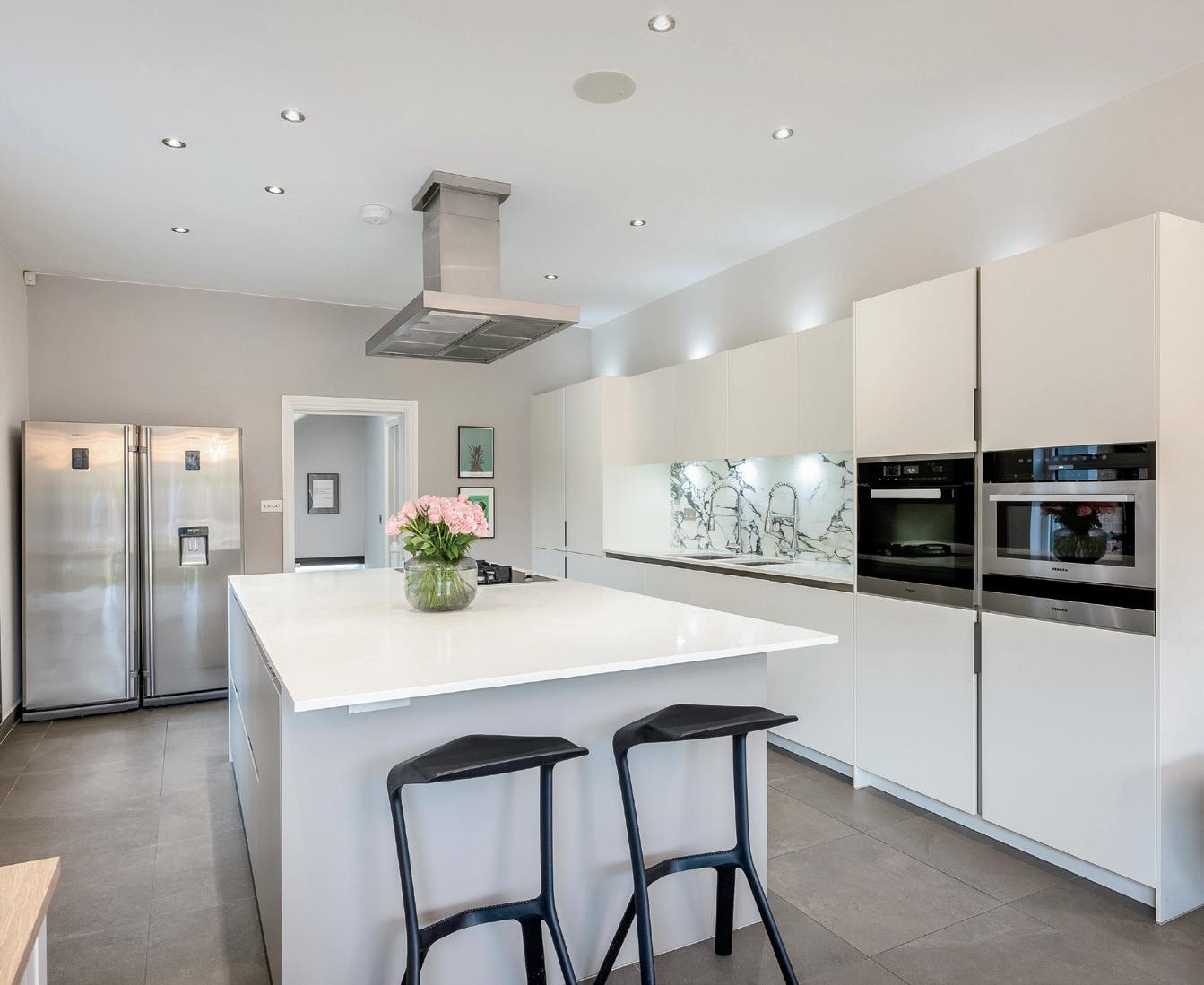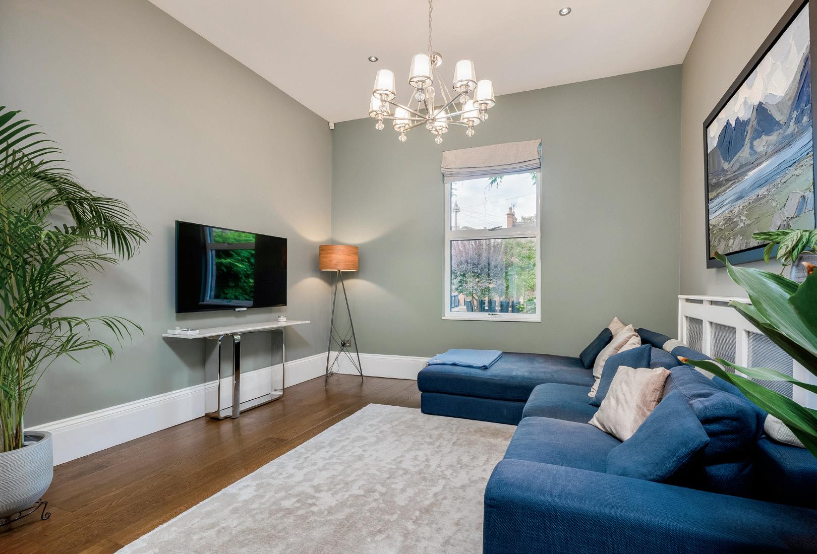 The entrance hallway gives a glimpse of the high standard of finishings on offer throughout this exquisite home and leads through to the substantial drawing room to the right and the formal dining room to the left. The opulent drawing room is flooded with light from a large bay window to the front and features an open fireplace with beautiful surround and recessed shelving to either side, hard wood flooring and continues through to the rear of the property with a window overlooking the garden.