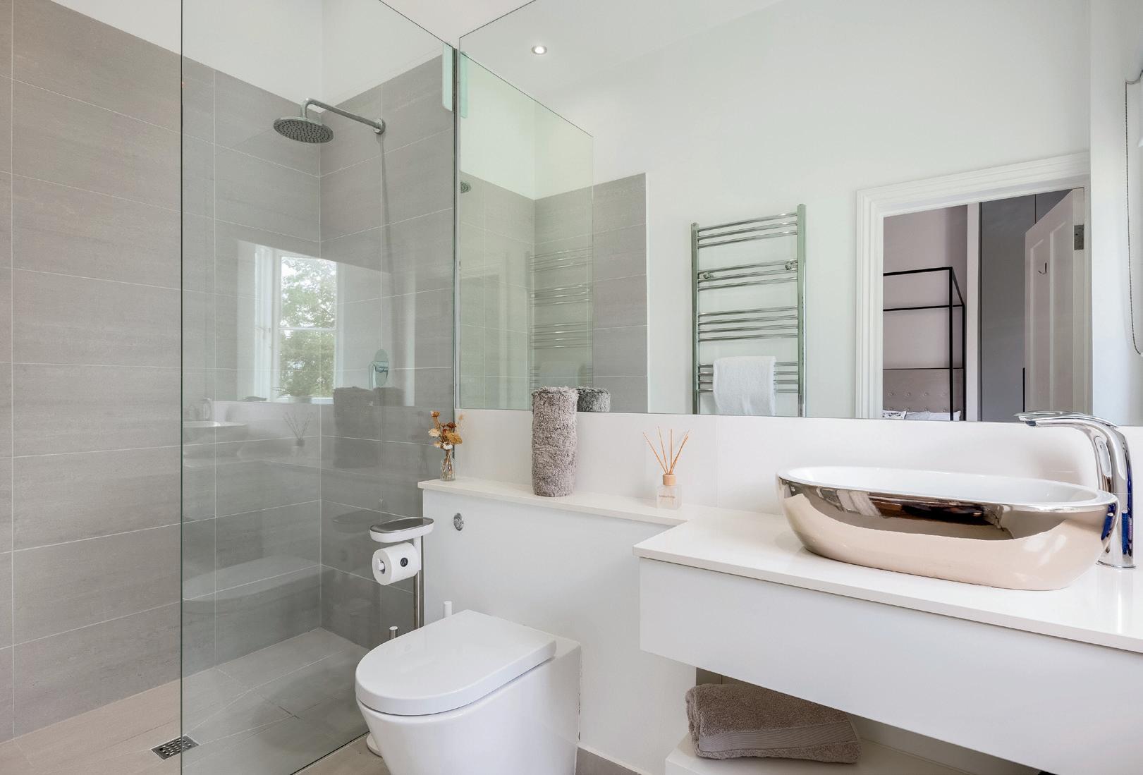 The family bathroom is of a very generous size and has a striking feature wall with freestanding bath and separate walk-in shower.