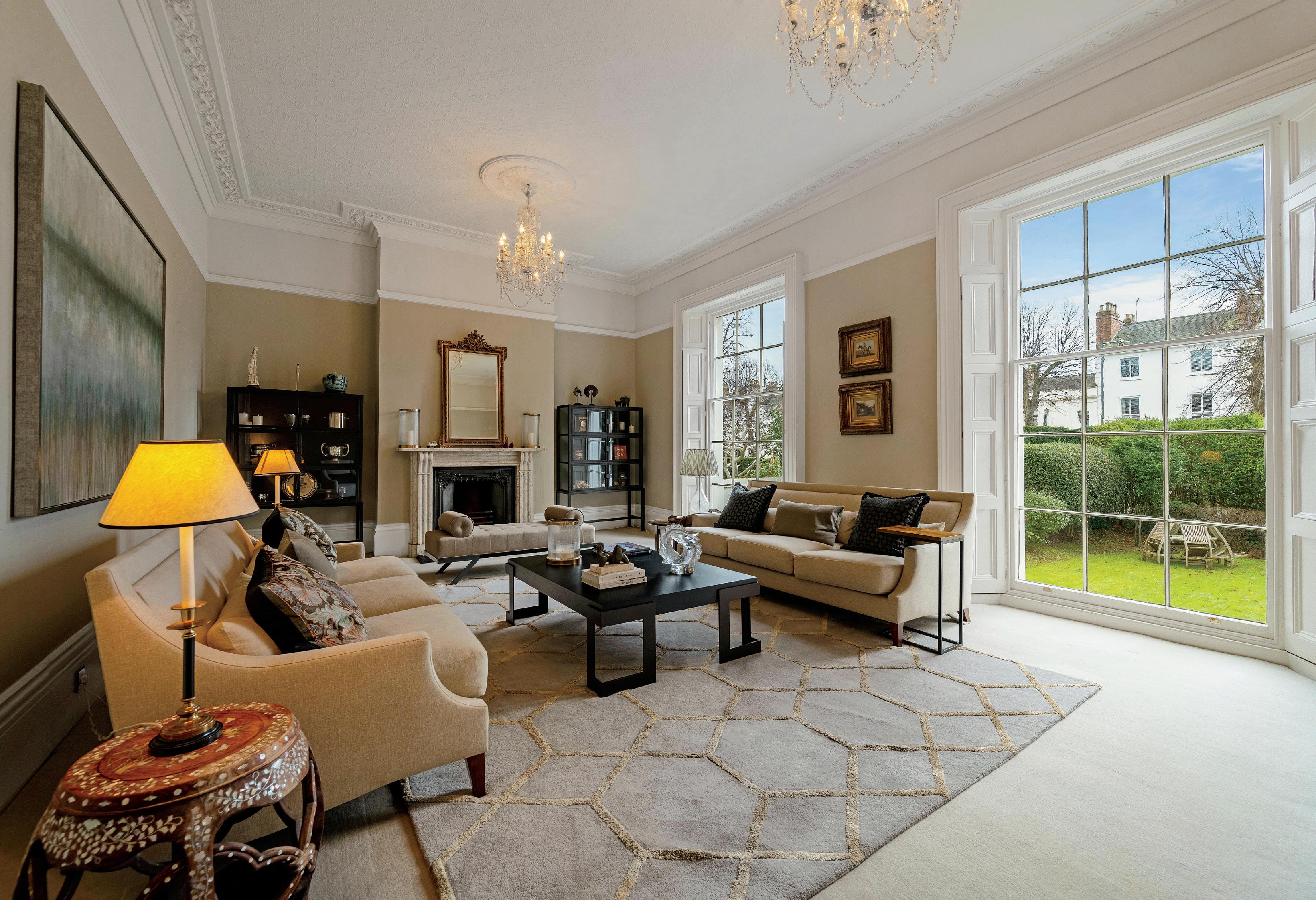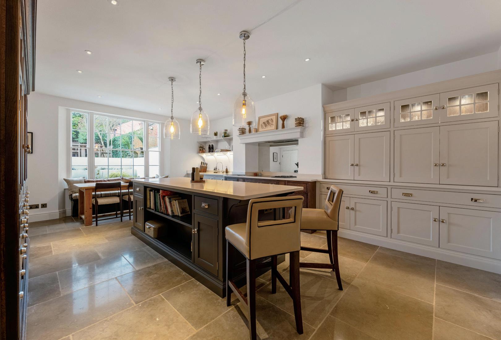The first floor features a bespoke kitchen with polished flagstone flooring, top-spec integrated appliances, large island and breakfast seating area. This is a beautiful family room with large sash windows providing plenty of light and views of the ornamental stepped garden.