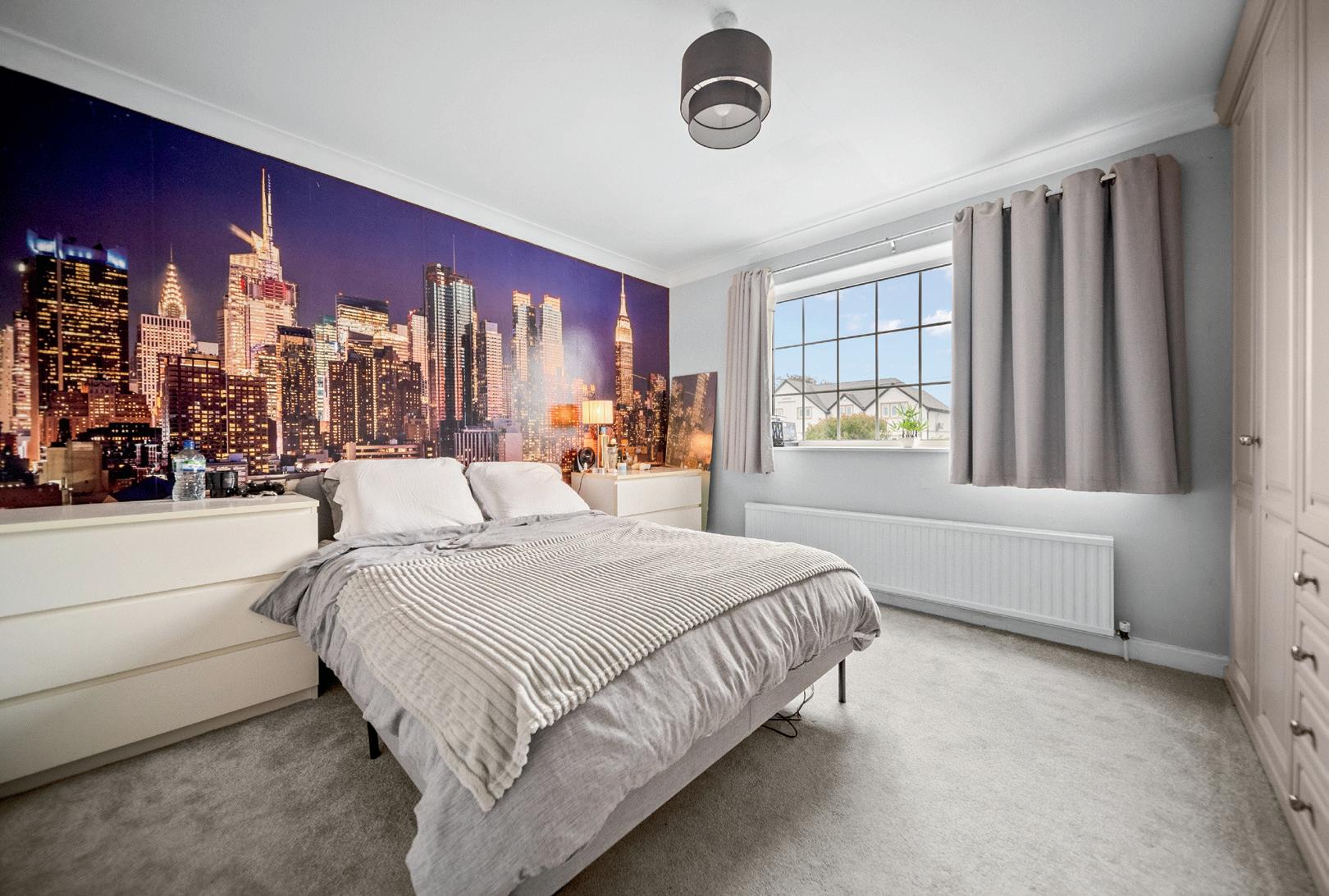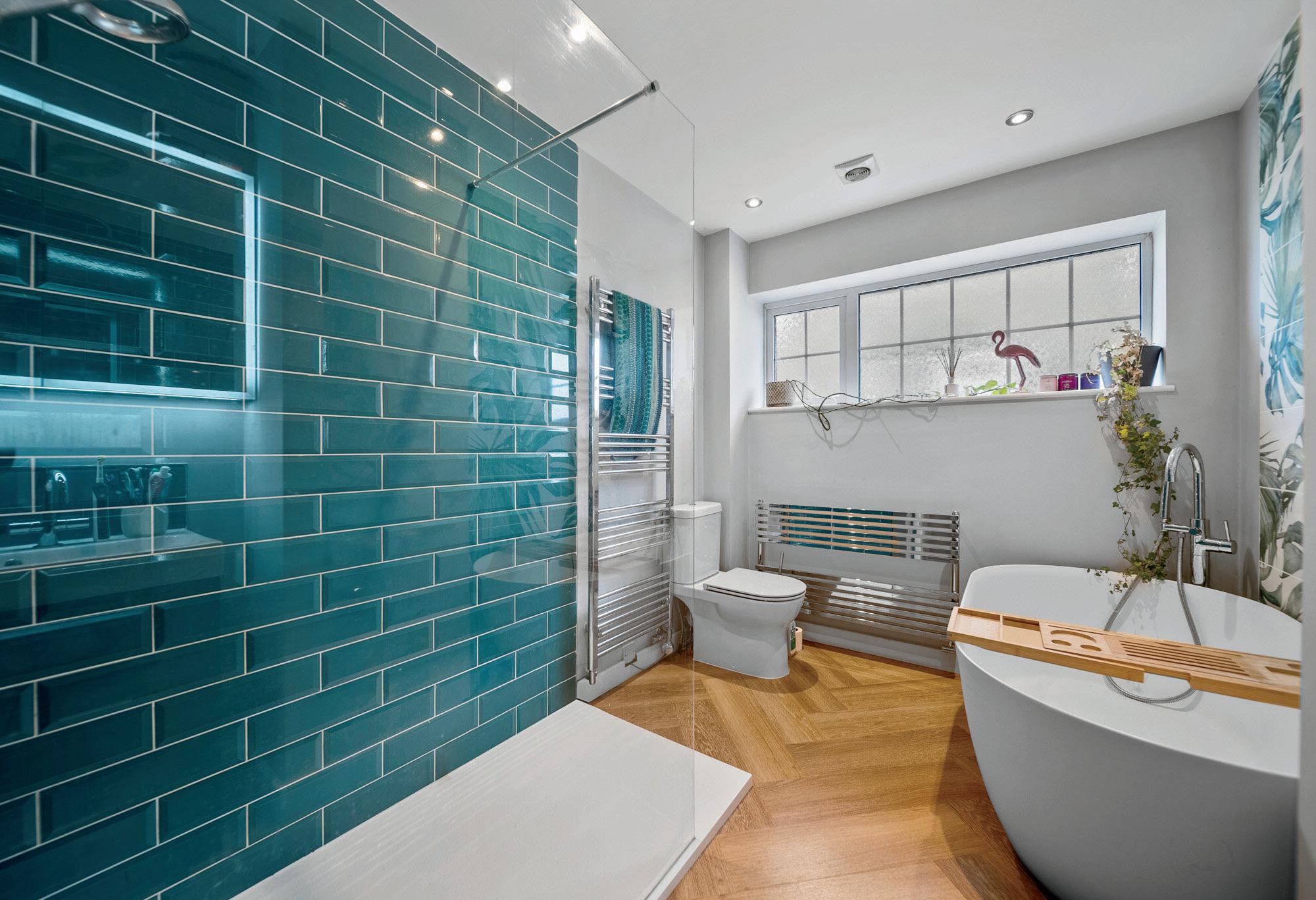Upstairs, a generous landing with a large rear window continues the home’s light and airy theme. This floor hosts five well-proportioned bedrooms, whilst the principal bedroom is a true highlight, featuring bespoke fitted sliding wardrobes and uninterrupted views of the surrounding greenery. The luxurious four-piece family bathroom showcases modern design with a freestanding bath, large walk-in shower, navy vanity unit, and low flush w/c.