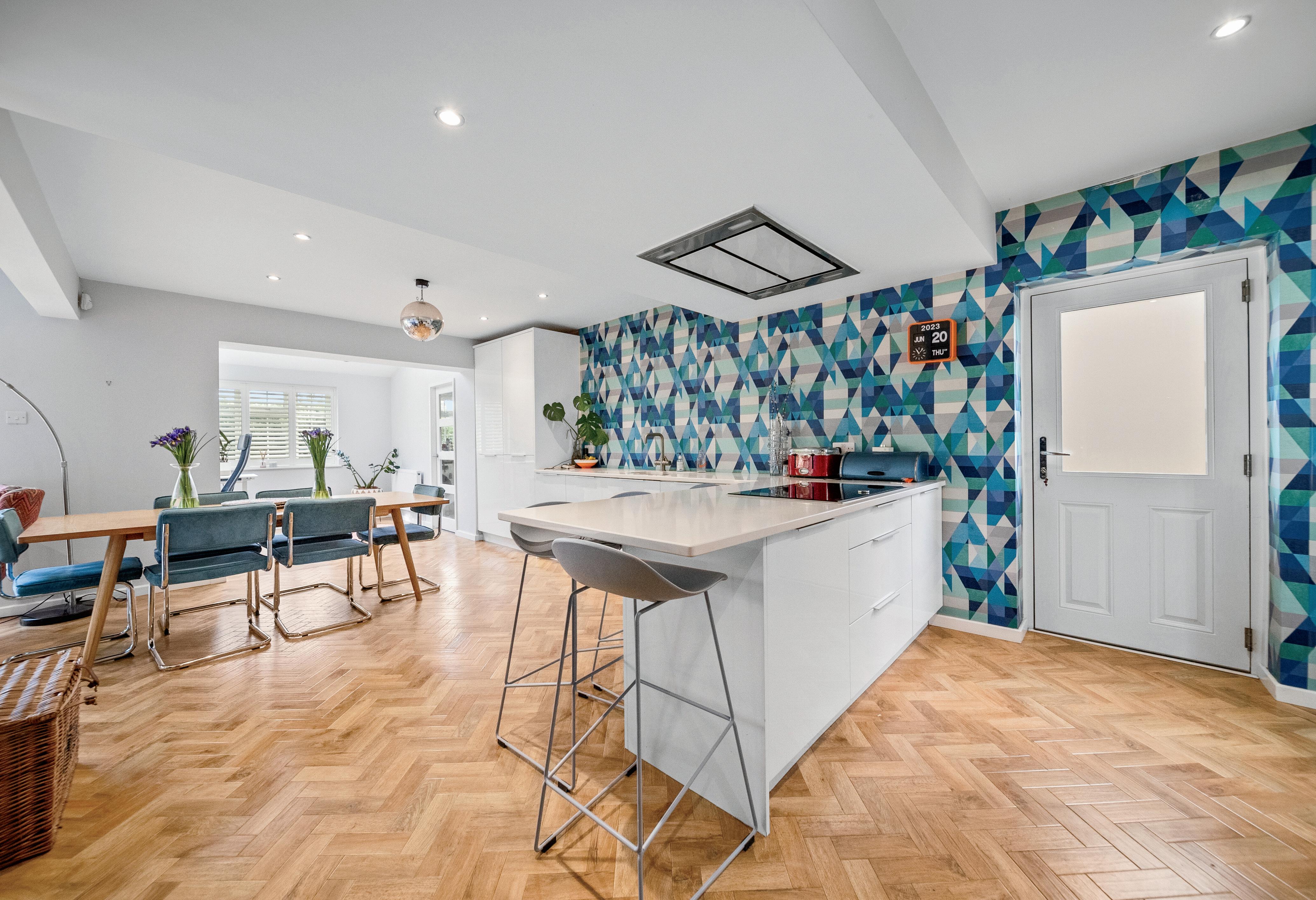 As you step into the welcoming hallway of this home, the quality and attention to detail are immediately apparent. Elegant Herringbone flooring flows seamlessly through to the openplan kitchen diner, creating a cohesive and stylish living space. Bathed in natural light thanks to a thoughtfully designed rear extension, this area truly forms the heart of the home.