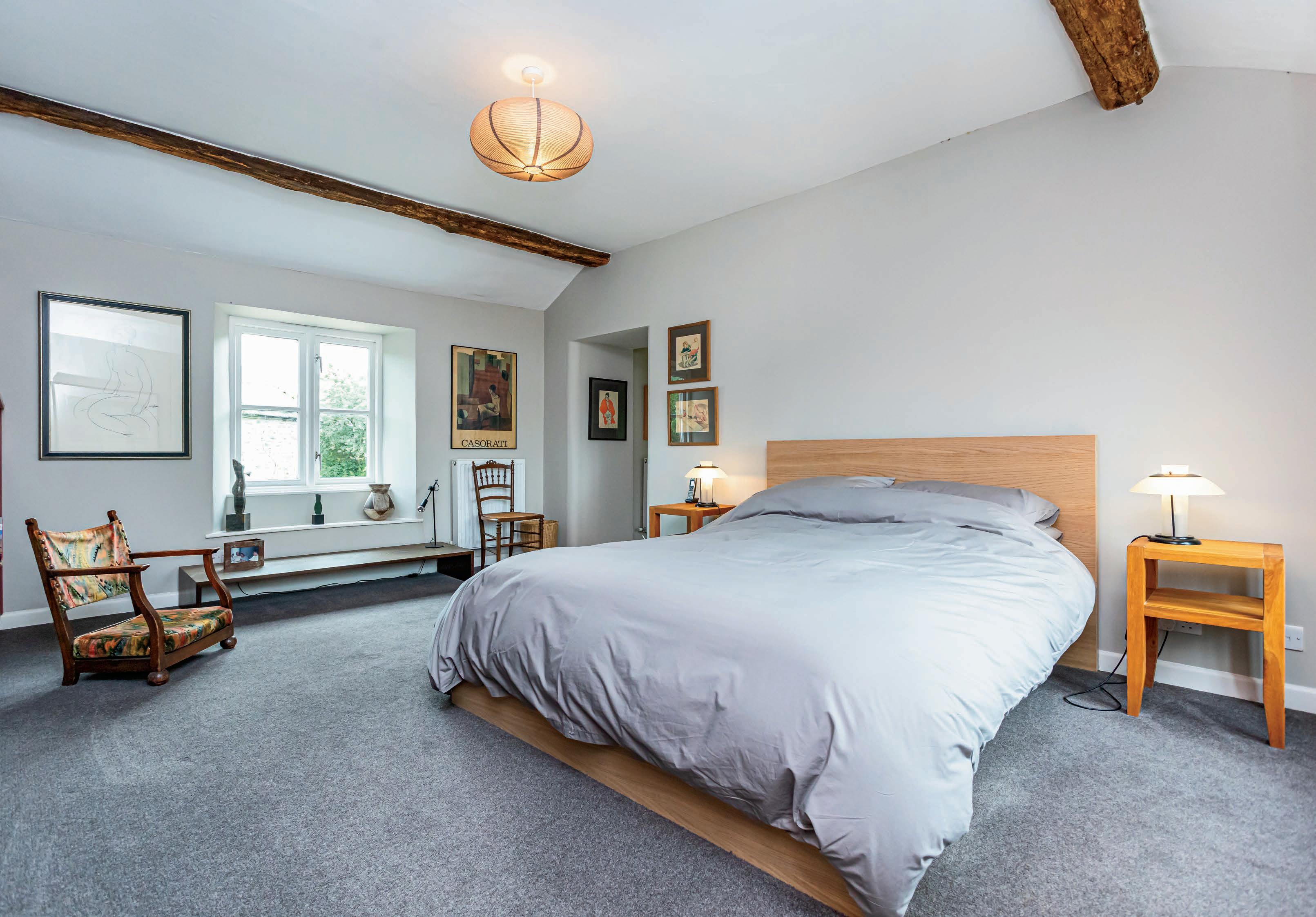 The principal bedroom is an absolute treat â airy and spacious with windows front and back it gets the first and last of the dayâs sun. The westerly view takes in the sedum roof of the dining room, the colours reflected in the Tuscan Red exterior paint of the farmhouseâs elevations. An entire wall is devoted to fitted bookcases and drawers, the ensuite is accessed through the walk-through dressing room which has floor to ceiling wardrobes and cupboards, the extra storage providing maximum practicality. An oak floor flows into the shower room where there is a three-piece suite and Travertine stone wall tiling.