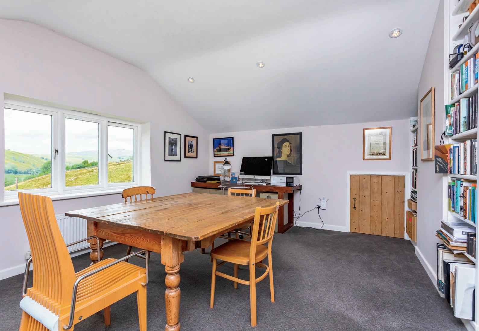 The heart of the house is the open plan living area which incorporates defined areas to cook, eat and relax. When the owners bought the house it was two unconnected spaces, a kitchen and a sitting room. They told us âWe could see how an extension built over the previous seating terrace in the crook of the sitting room and kitchen would connect the two spaces,, and create a lovely open plan living areaâ. Itâs worked a treat; the spaces are both connected and yet cleverly retain a degree of separation; sociable and absolutely wonderful for family living and when you welcome friends over. The large corner window draws you forward to gaze at the undulating fells and unspoilt pastoral scene, no wonder the comfy chair positioned here is a sought-after spot. A glazed door in the dining area encourages spilling out onto the flagged seating terrace in warmer weather. A flagged floor connects the dining room and kitchen which has a practical elegance about it with clever design details. Bespoke oak cabinets are topped with slate or oak tops and were designed and made by a cabinet maker who understands how much the owners love to cook and invite guests over to eat. Ever the country classic, an Aga is at the heart backed up with a comprehensive range of integral appliances and a useful central island unit. The final third of this elegant yet friendly space is the inviting sitting room, the full width of the far wall is fitted with oak bookcases, hunker down around the wood burning stove in colder months as you sit on the window seat and watch the wind and weather as it sweeps down the valley.