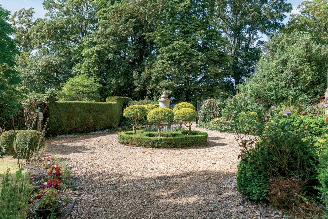 The double wrought iron gates at the rear of the property open to a south-facing garden, revealing a circular gravel driveway framed by box hedging and various planted borders. This secluded garden is beautifully maintained, offering a well-established and lush retreat. The roof was made from local Colley Weston tiles.