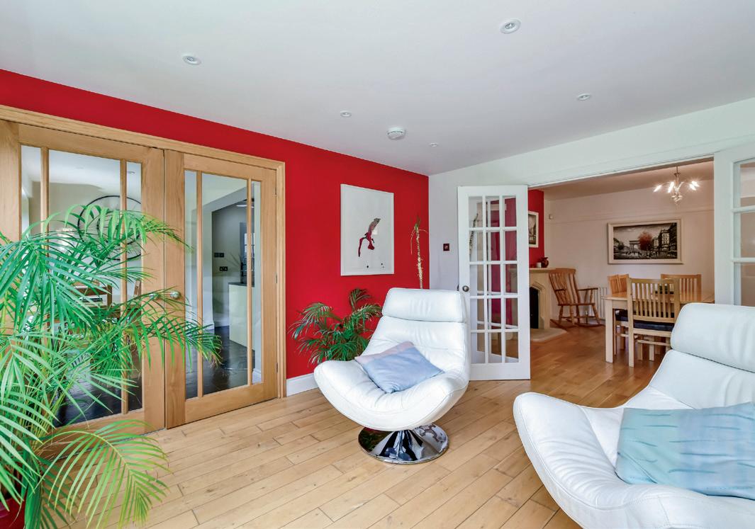 Flowing from the kitchen, the sitting room continues the theme of comfort with wood flooring and patio doors that open directly onto the garden, an ideal space to unwind or entertain.