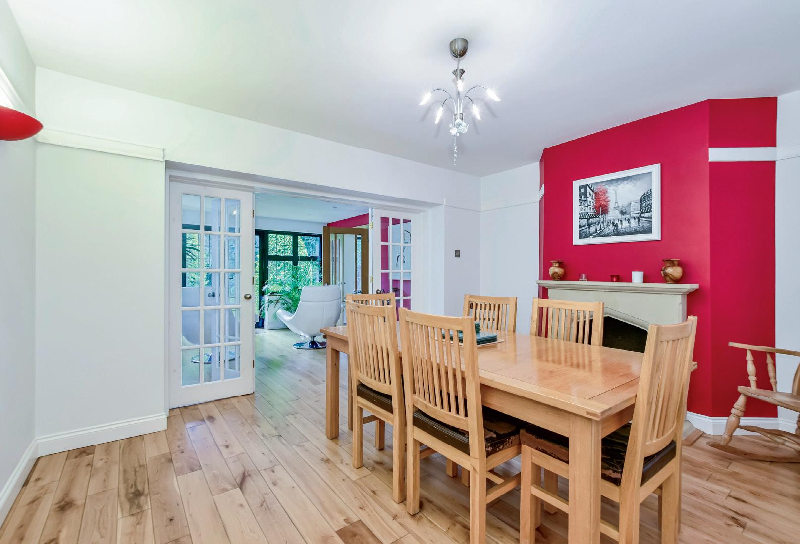Double French doors connect the sitting room to the elegant dining room, where another feature fireplace adds warmth and character, perfect for family meals or entertaining guests.