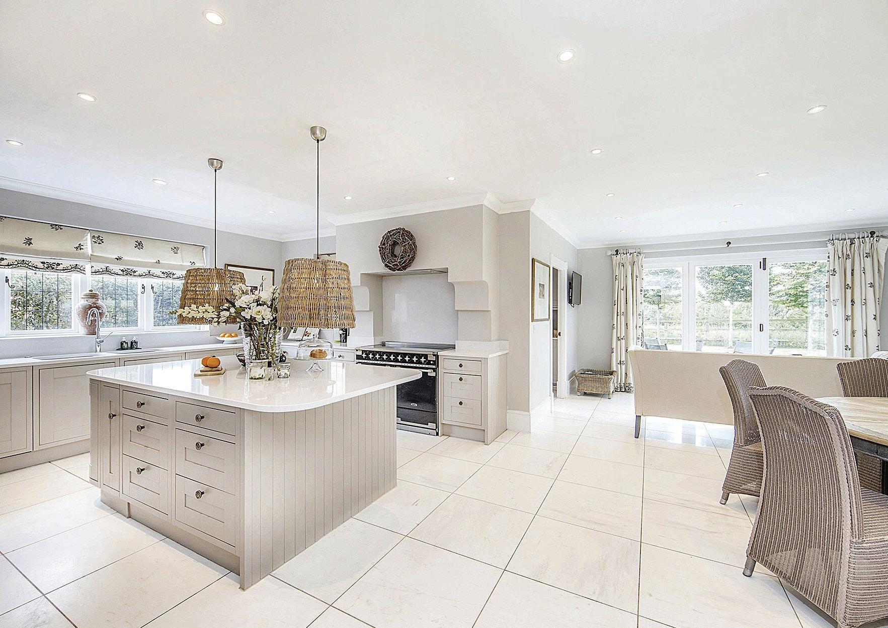 The ground floor is adorned with exquisite Porcelanosa Carrara marble tiles, which enhance the sense of space and light. Each room exudes a warm, welcoming ambiance, perfect for both family gatherings and intimate moments. The sitting room, with bi-fold doors that open to the outside, is ideal for a peaceful start to the day or relaxing evenings by the log-burning stove.