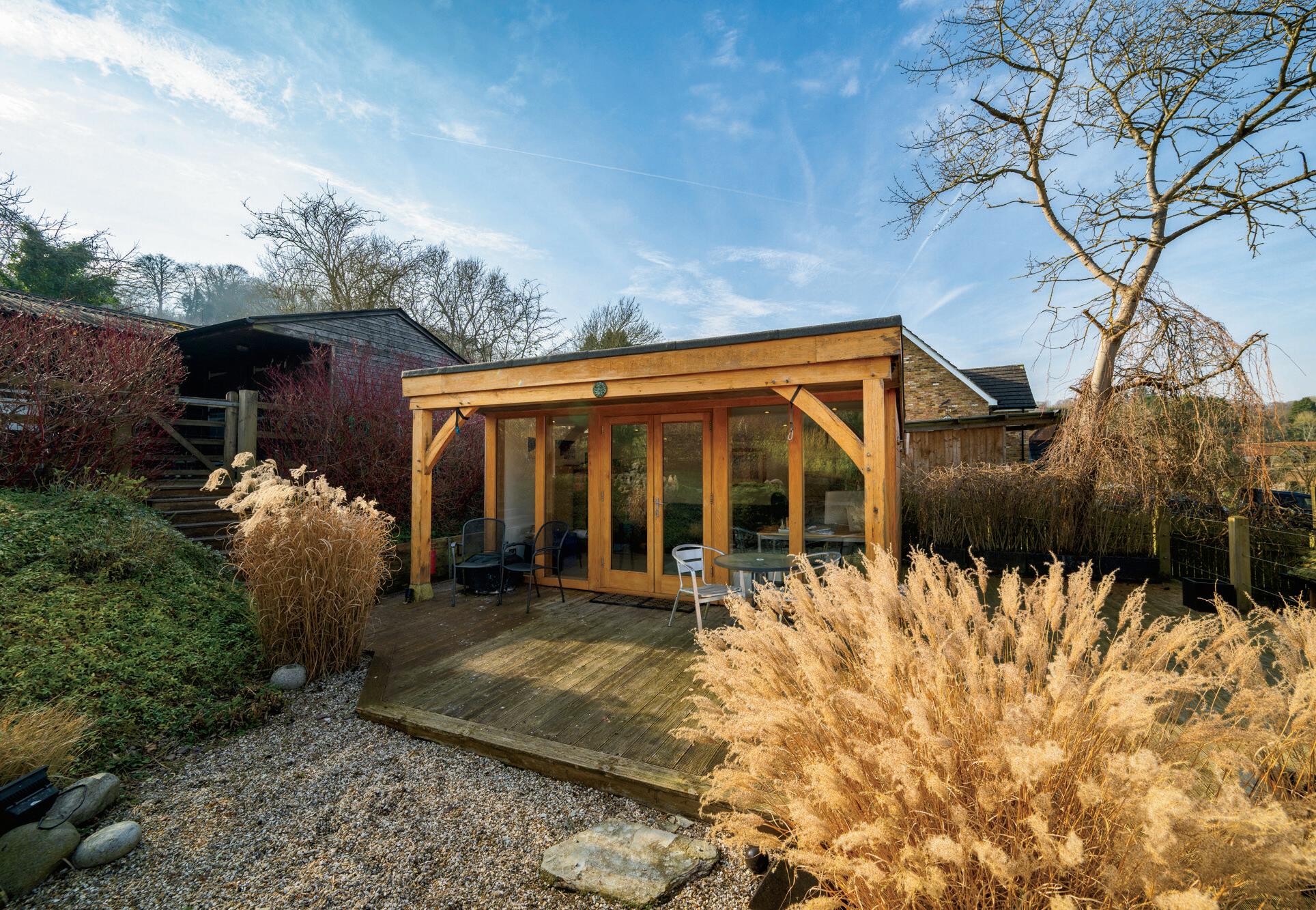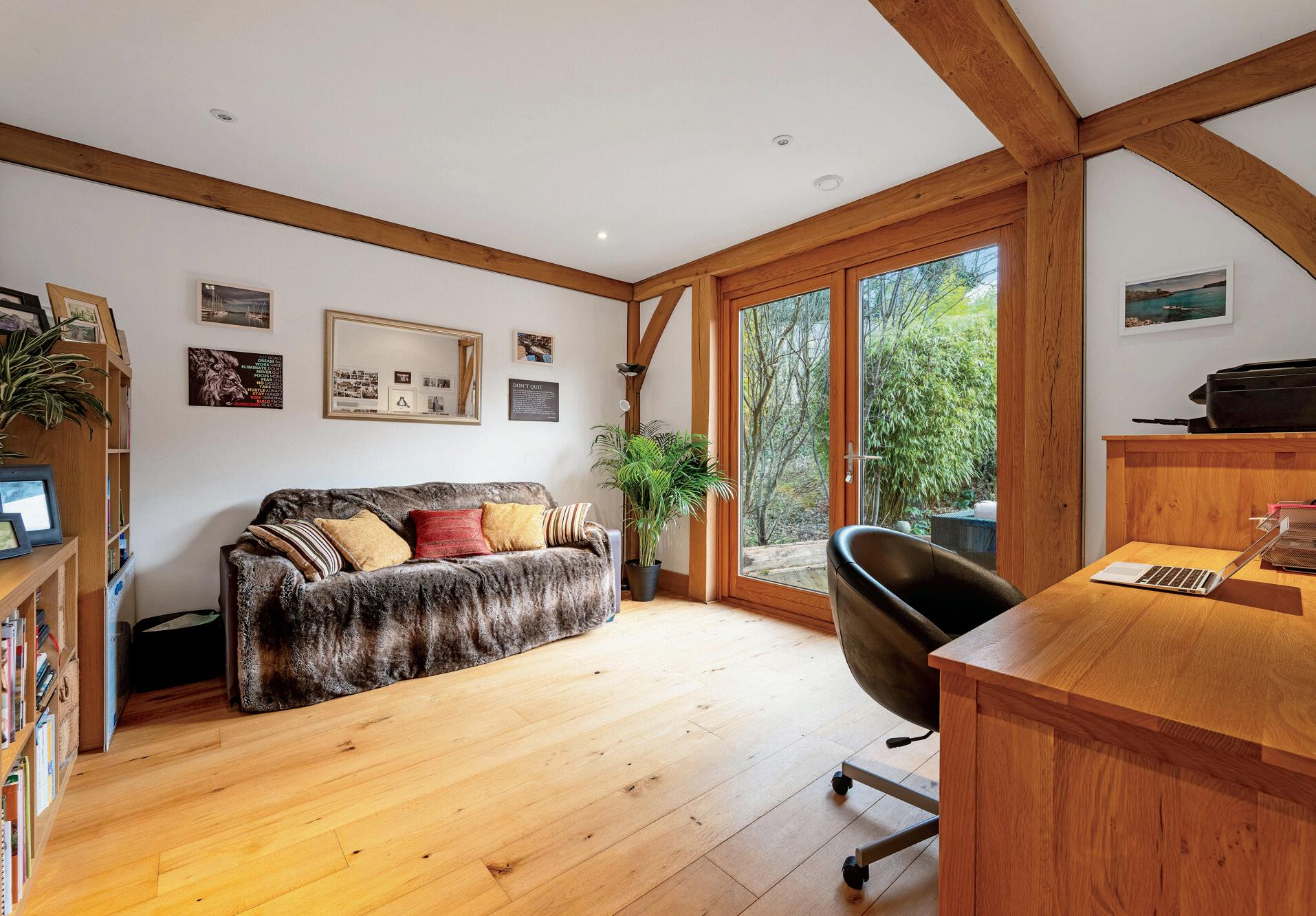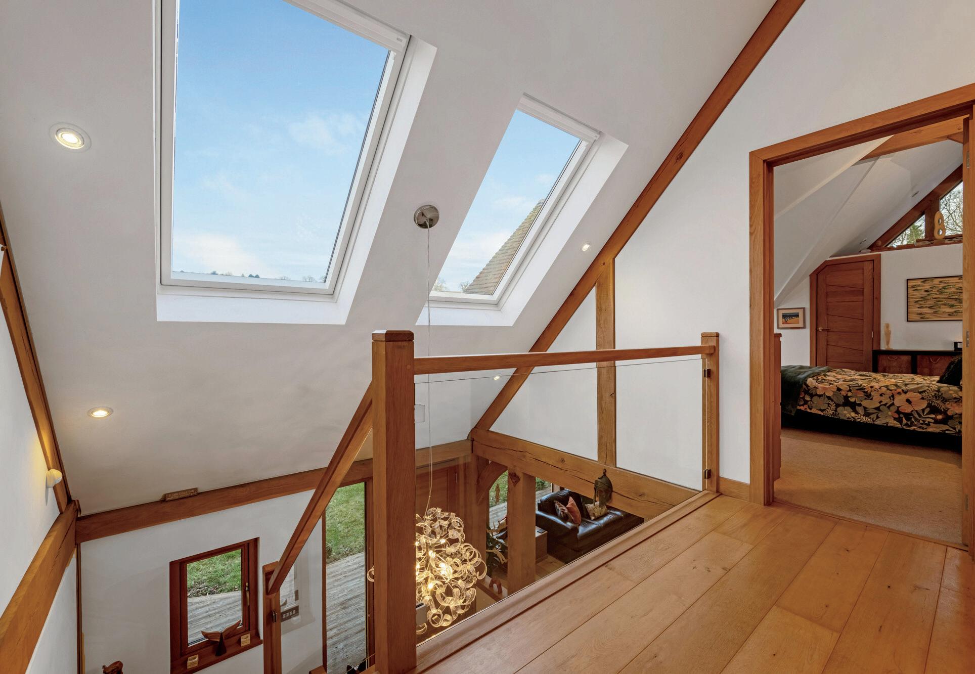 Stepping inside, we designed the layout to instill a sense of calm from the m oment you walk through the front door. The airy entrance hall, galleried landing, and vaulted ceilings all work together to amplify light and space, while floor-to-c eiling windows invite the outdoors in, especially at sunrise, when the valley is bat hed in a warm, golden glow. The underfloor heating makes winter mornings won derfully cosy, yet on bright summer days, you’ll want to open the bi-fold doors to the terrace and savour the fresh air. Our garden office offers a peaceful spot to work, and we’ve created various outdoor seating areas to suit every occasion, from hammock naps to sunset dinners.