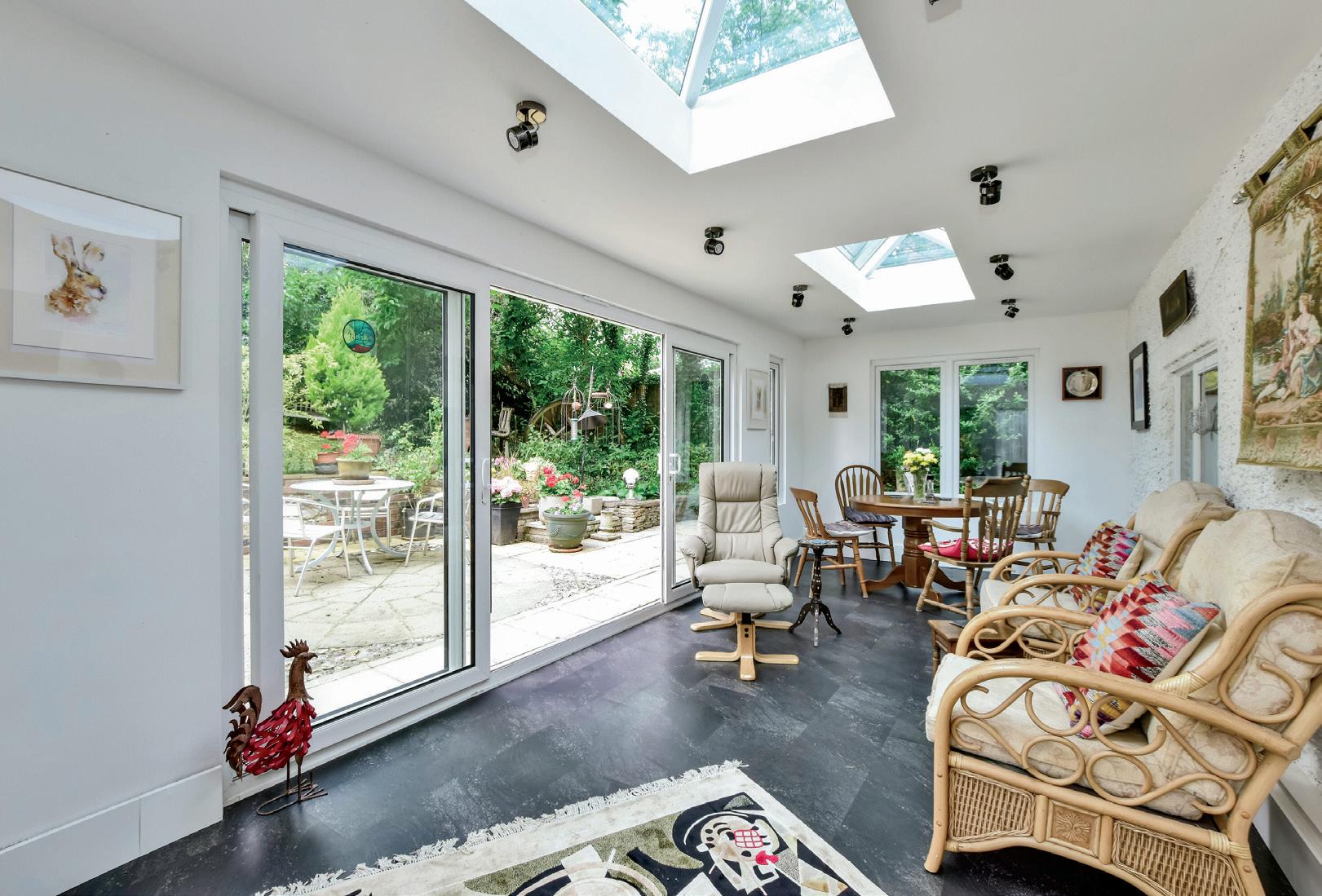 Also adjoining the kitchen is the beautiful garden room, a recent addition completed in 2021. Featuring two skylights that flood the space with natural light, efficient skirting heating, and patio doors opening onto the garden, it provides an ideal space to relax and unwind throughout the year.