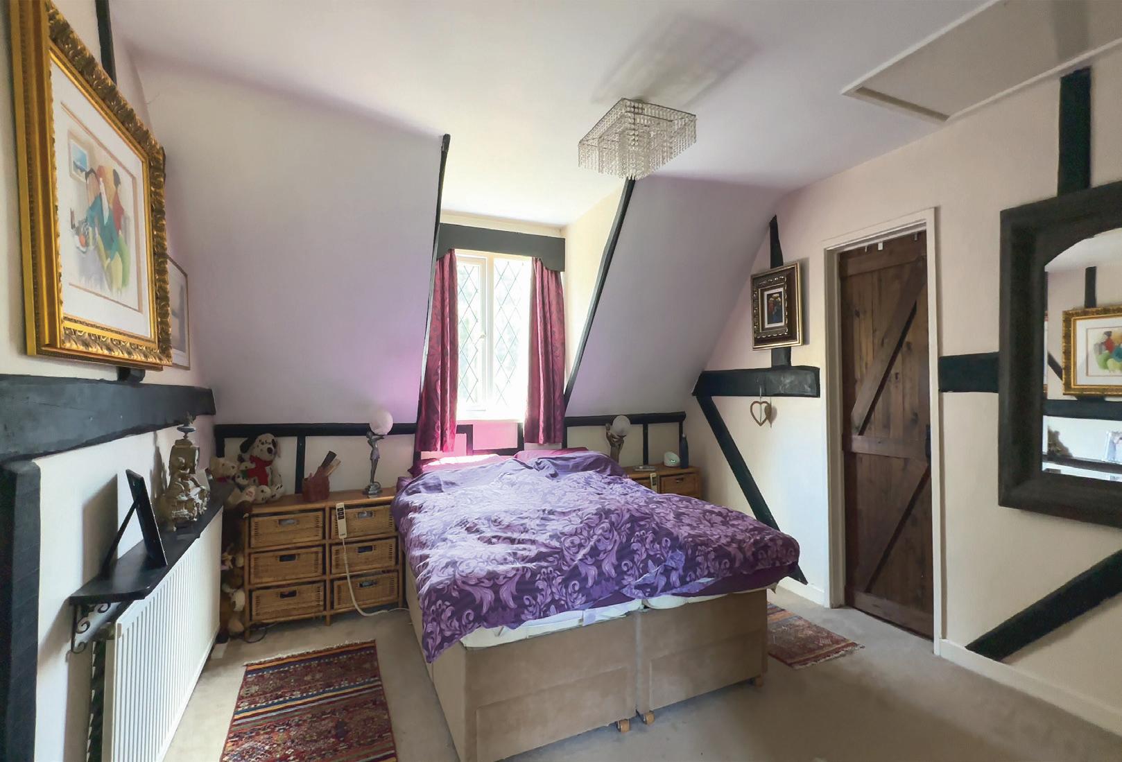 The first floor of the cottage opens onto a spacious landing, currently used by the owners as a home exercise area. This generous space sets the tone for the rest of the floor, where character continues in abundance with exposed beams throughout.