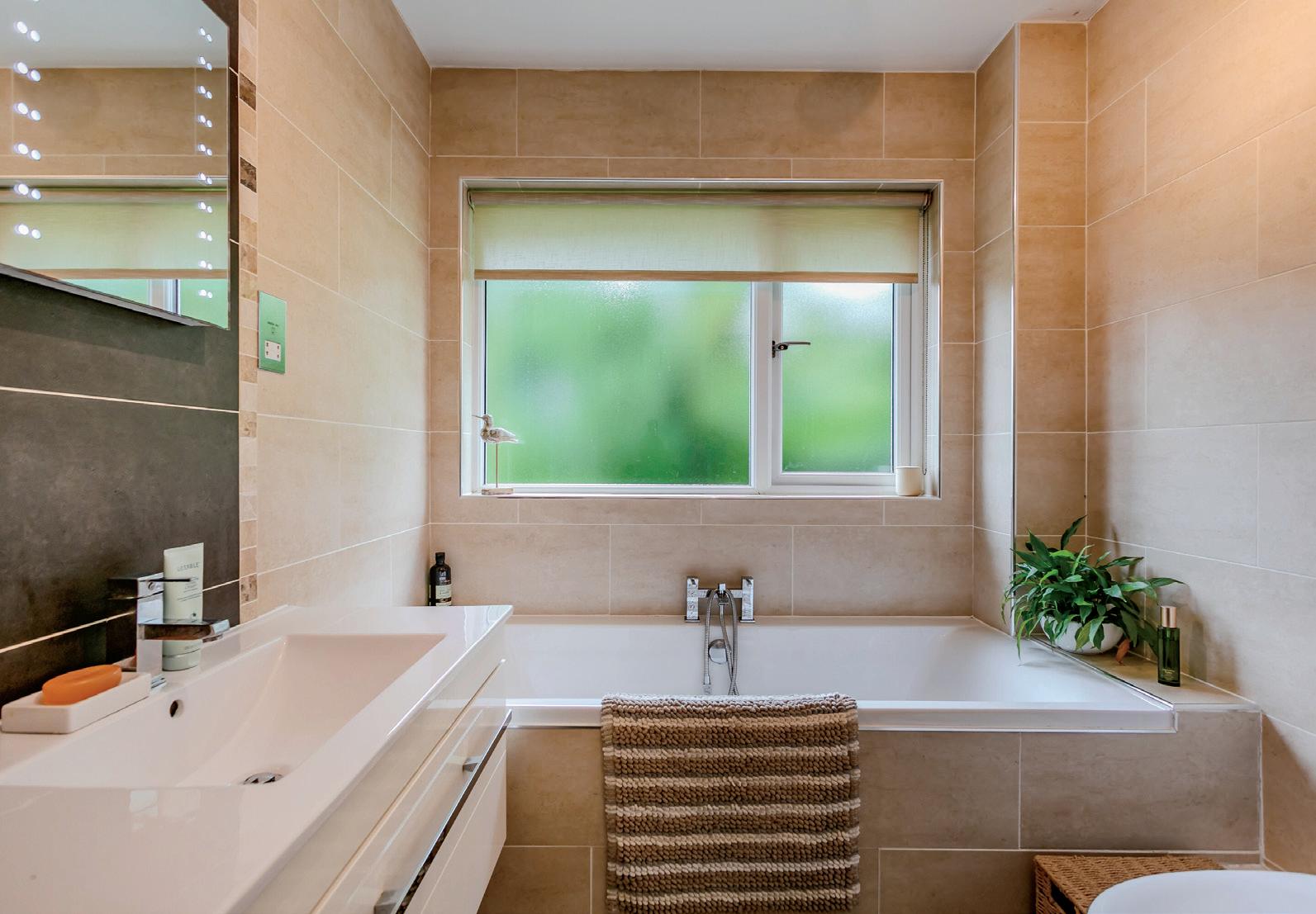 Stairs rise to the first floor where the generous landing has a far-reaching view and space for a desk, comfy reading chair or sewing table. There are four double bedrooms, the outlook from the two on the south facing elevation are fabulous, both have fitted wardrobes as well. From the fourth room there is a door out to the flat roof above the garage. The house bathroom has been refitted in a contemporary style and has a double ended bath for a leisurely soak, a separate shower for when time doesn’t permit such luxury, a floating vanity unit and loo.