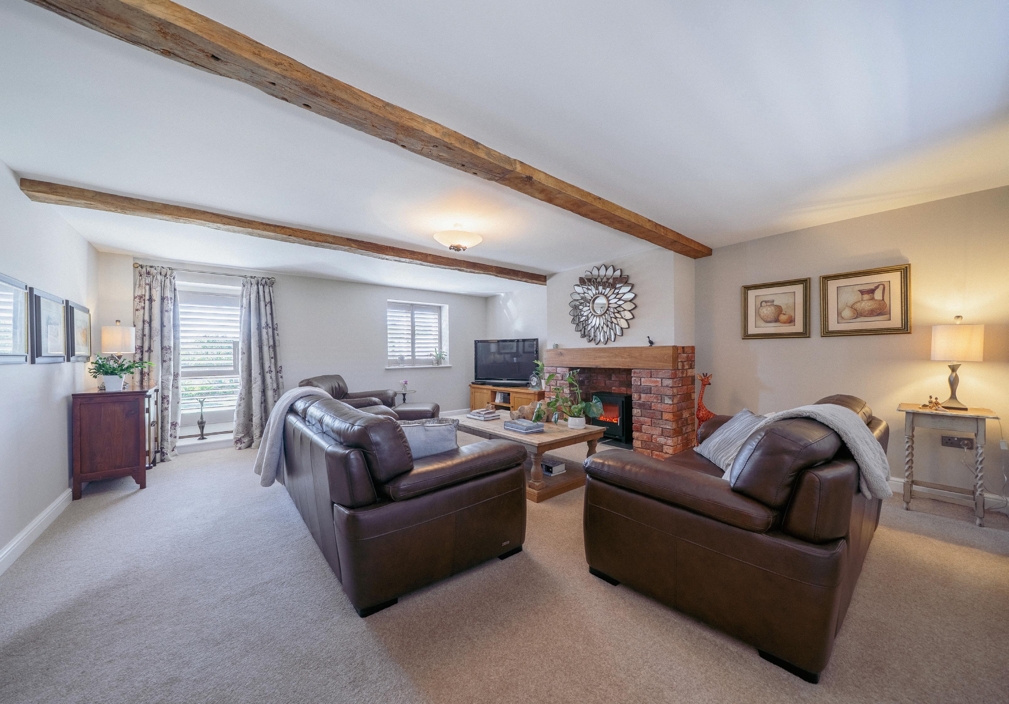 The formal dining room is cosy and perfect as a snug, playroom, or cinema room. A feature Cheshire brick fireplace takes centre stage in the sitting room, with windows looking out to the courtyard and southwest gardens. A door leads directly to the patio. Original beams showcase the home’s heritage while embracing modern elegance.