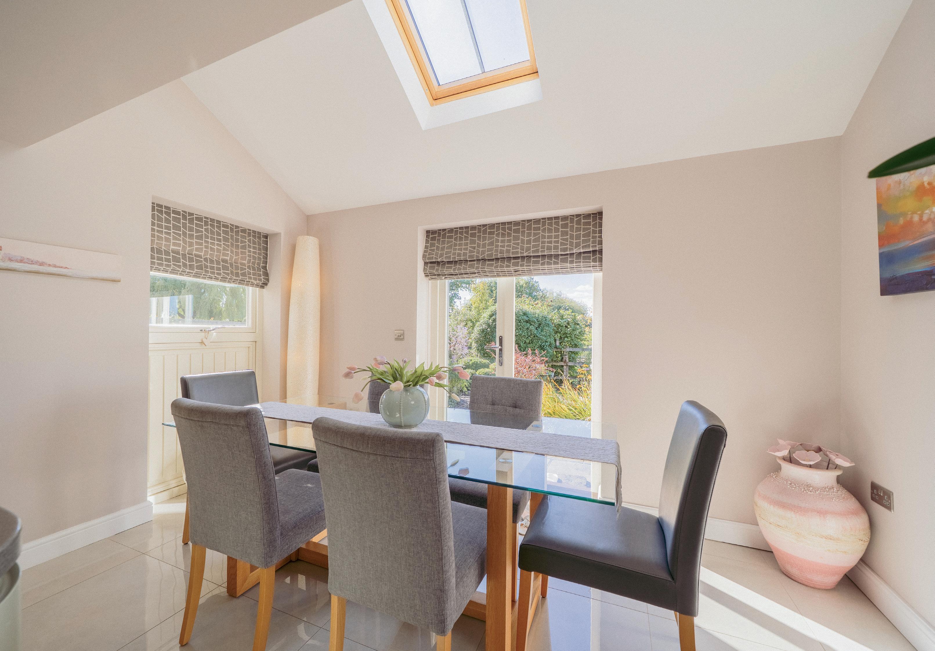 The kitchen is a beautifully designed space with a long central island, high-end appliances, and a bespoke banquette seating area — ideal for family gatherings, informal dining, or entertaining. French doors open directly onto the southwest-facing patio and gardens, blending indoors with out. A large utility room and guest cloakroom complete the practicality.