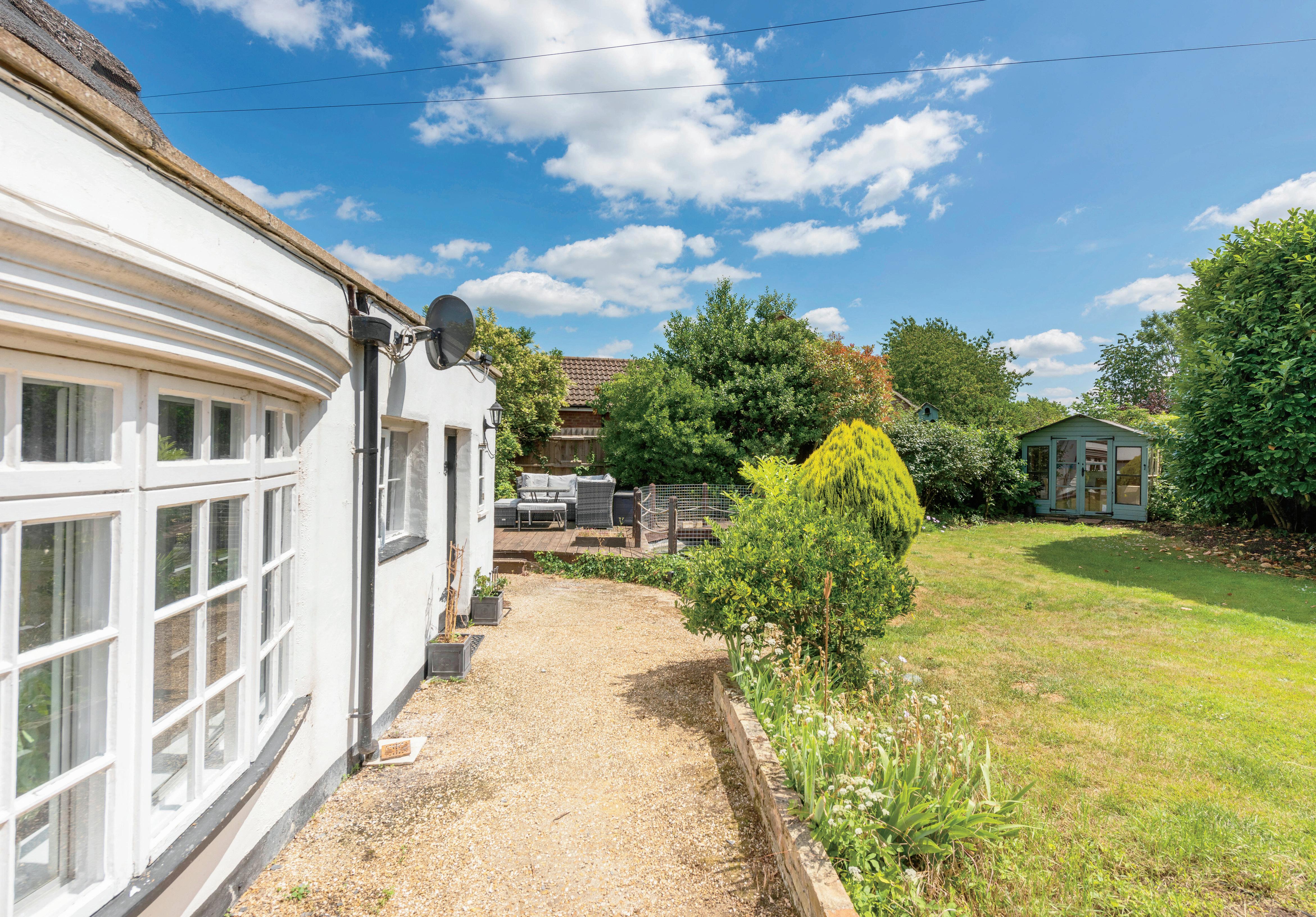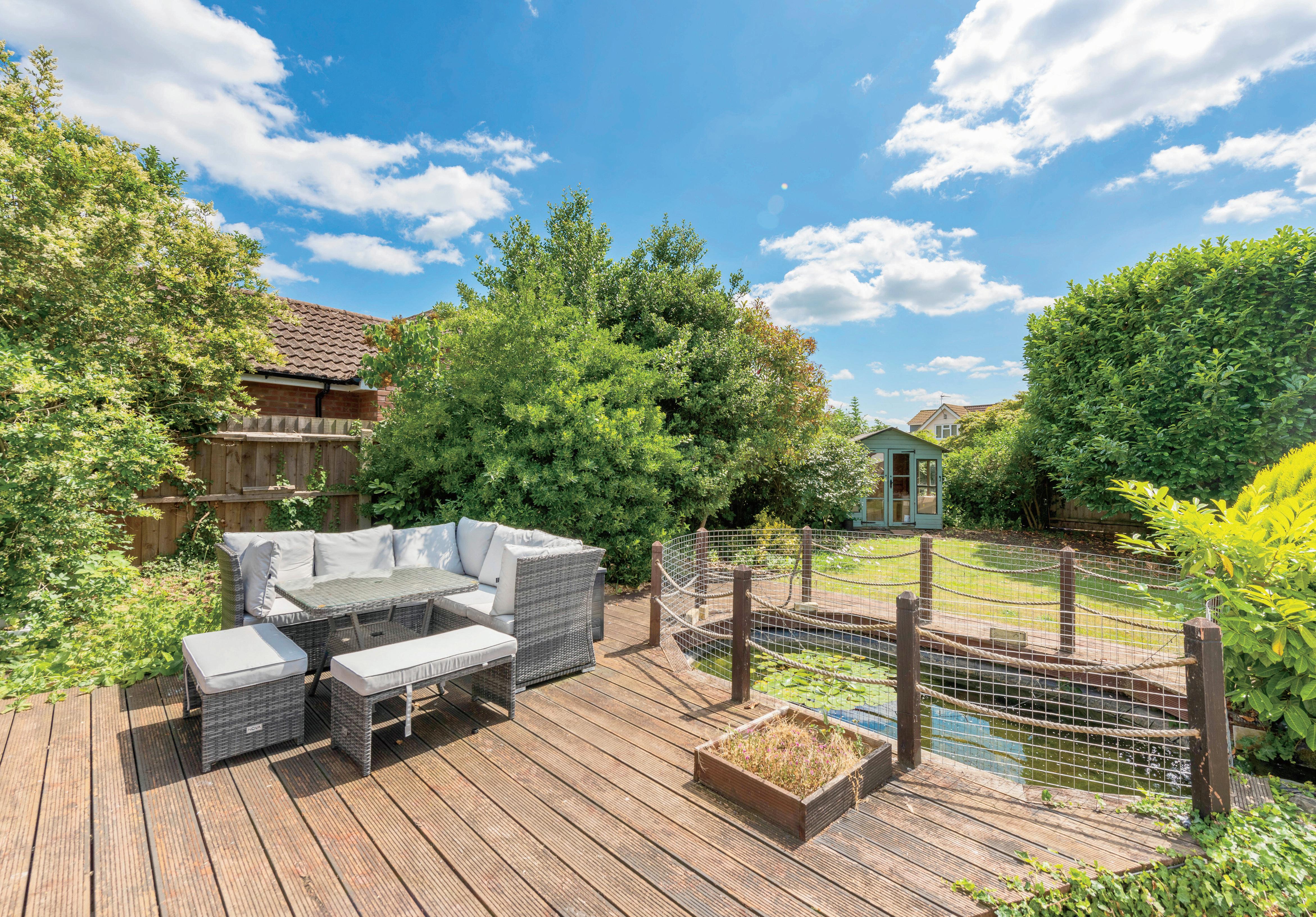 Outside, the enchantment continues. The front garden, mainly laid to lawn, offers an attractive approach to the property. To the rear, the expansive south-facing garden is a true sanctuary, featuring a wide lawn, a charming, decked seating area, and a pond, ideal for relaxing or entertaining in the sunshine. A gated gravel driveway provides ample off-road parking for residents and visitors alike.
