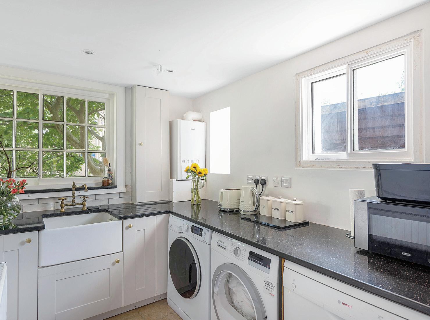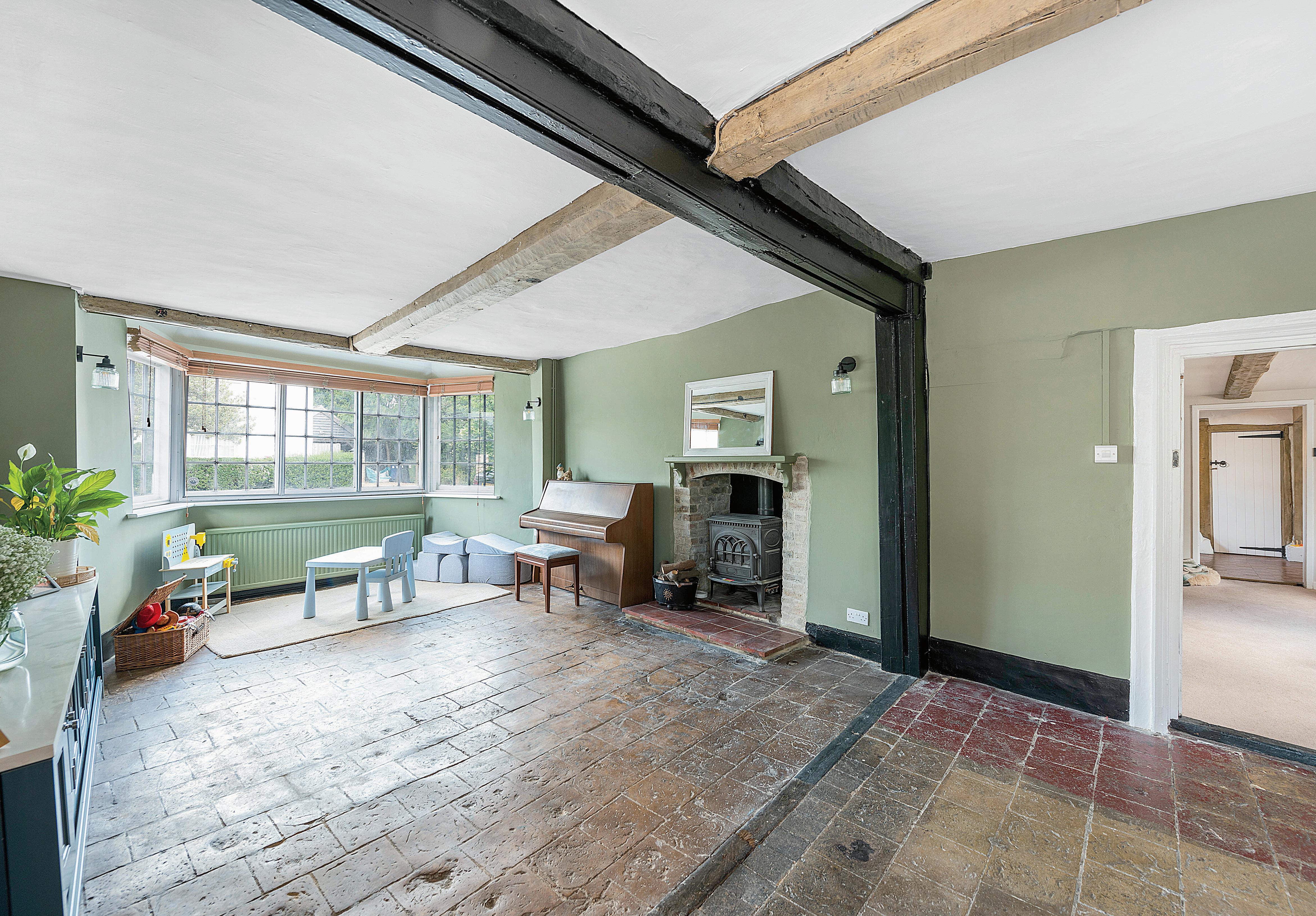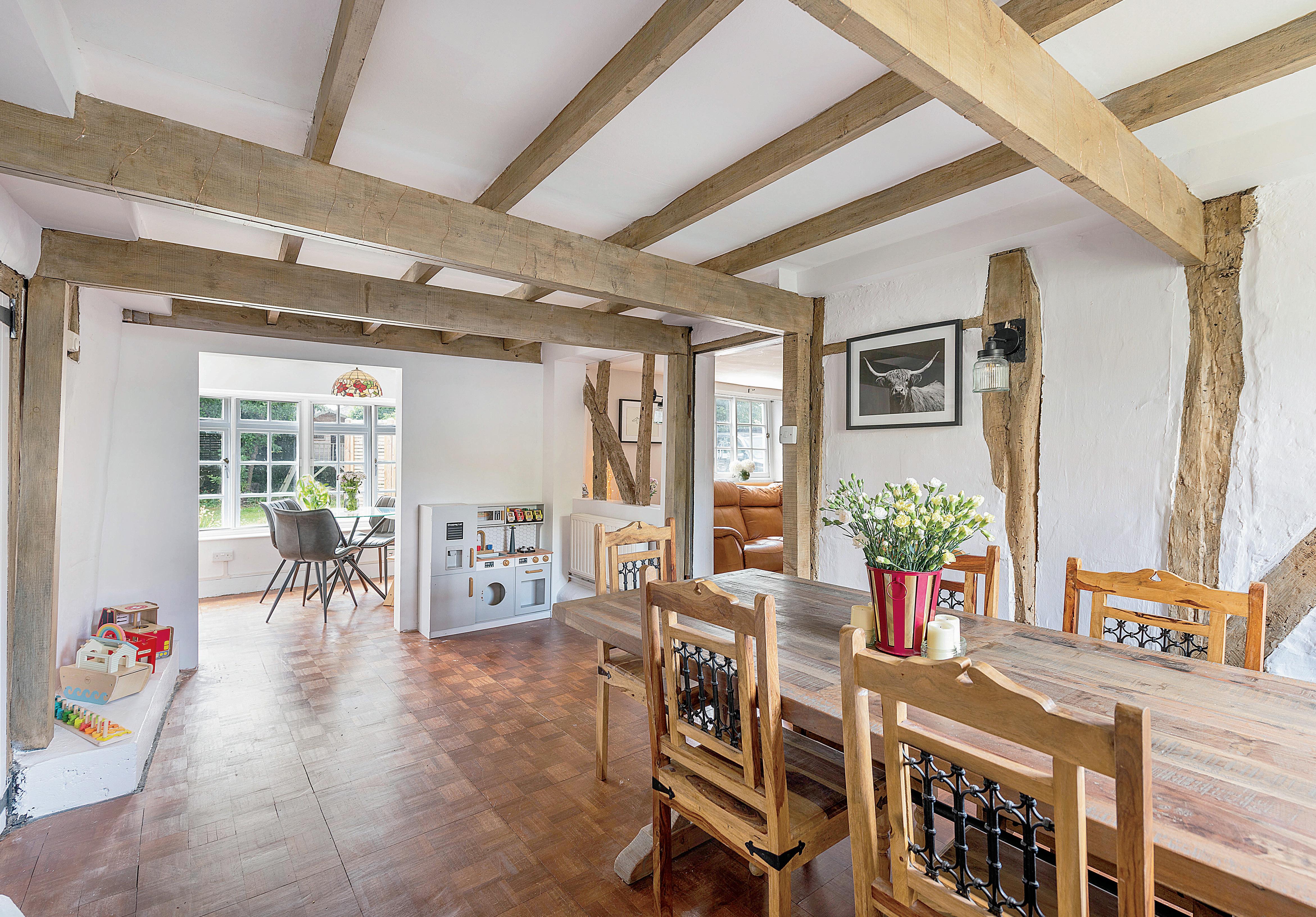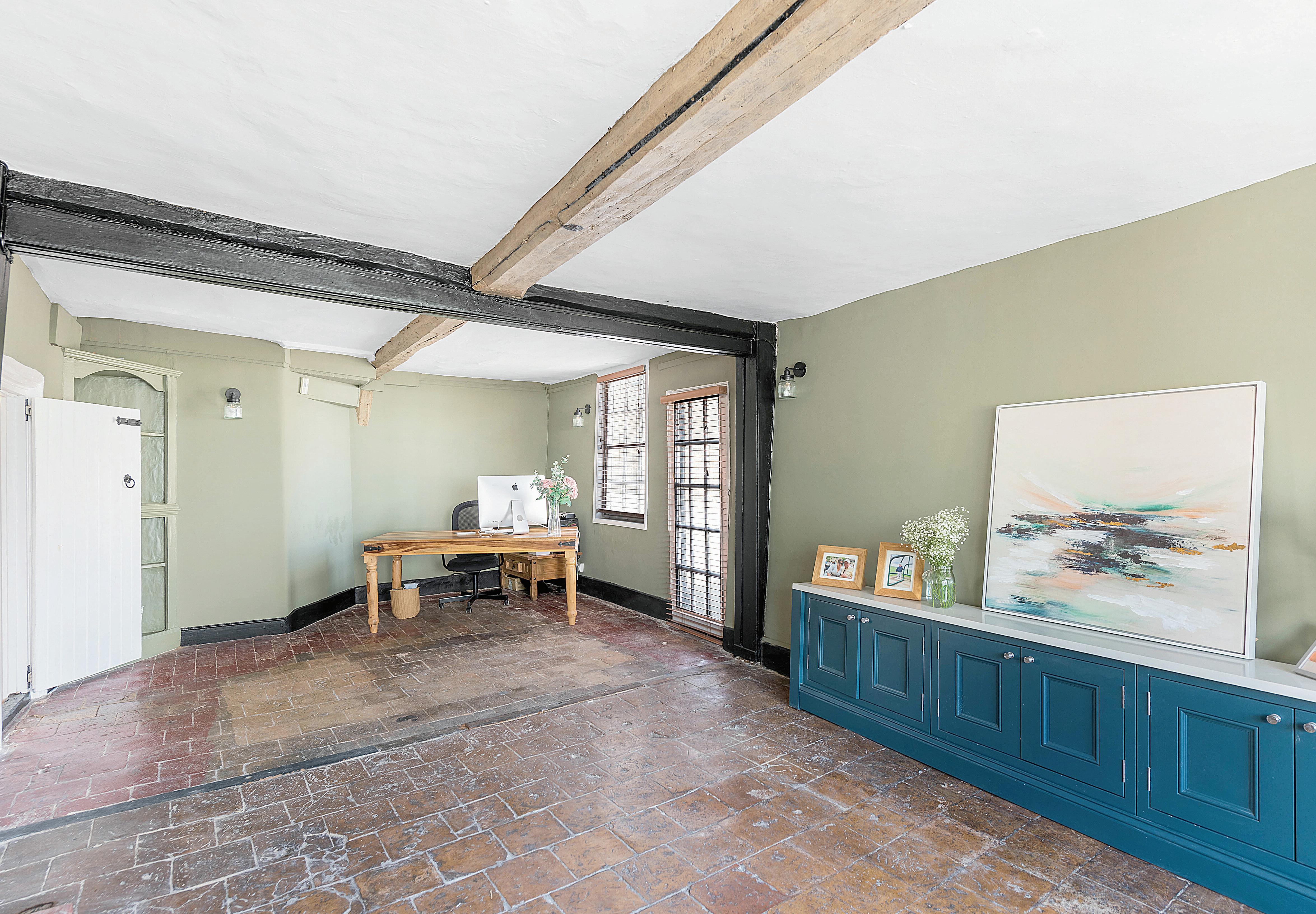 The elegant dual-aspect sitting room is a highlight, featuring a magnificent inglenook fireplace that forms the heart of the space and exudes warmth and character. A delightful door opens directly onto the south-facing rear garden, inviting natural light and providing seamless access to the outdoors.
