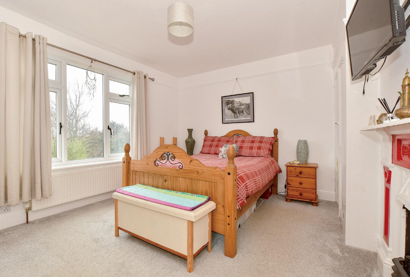 A staircase leads from the entrance hall to the first floor, where four spacious double bedrooms enjoy far-reaching views across the grounds and towards the Downs. The principal bedroom benefits from a private south-facing balcony, while a contemporary family bathroom, complete with a freestanding bath and separate shower, serves the remaining rooms.