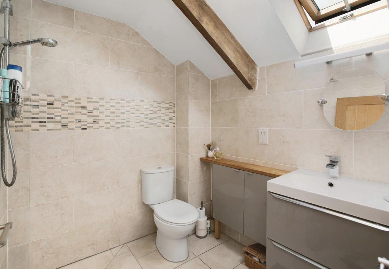 Upstairs, the first floor offers three well-proportioned double bedrooms, all flooded with natural light thanks to thoughtfully placed Velux windows throughout. The principal bedroom is a true retreat, featuring two striking accent walls with sunken niches framed by exposed stone — a unique design element that echoes the barn’s rustic heritage. This room also benefits from a stylish en-suite wet room, finished in warm, neutral beige tiles for a calm and elegant feel.