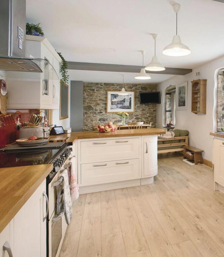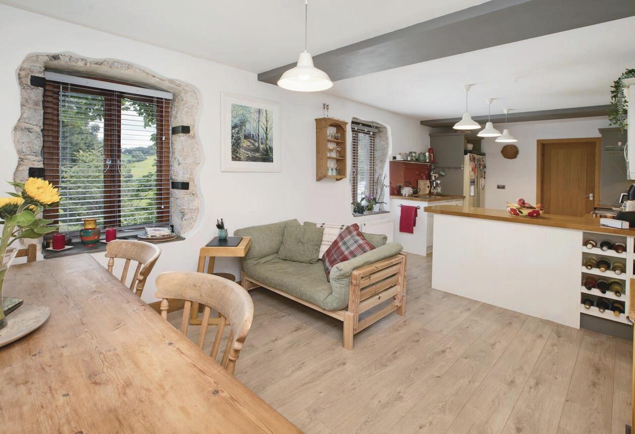 A glazed door opens into the kitchen and dining area, where the eye is immediately drawn to twin windows overlooking the beautifully landscaped gardens and rolling countryside beyond. Framed by exposed stone and resting on a granite sill, the windows create a picturesque focal point. There’s ample space here for a table and chairs, making it a cosy and inviting spot for informal dining.