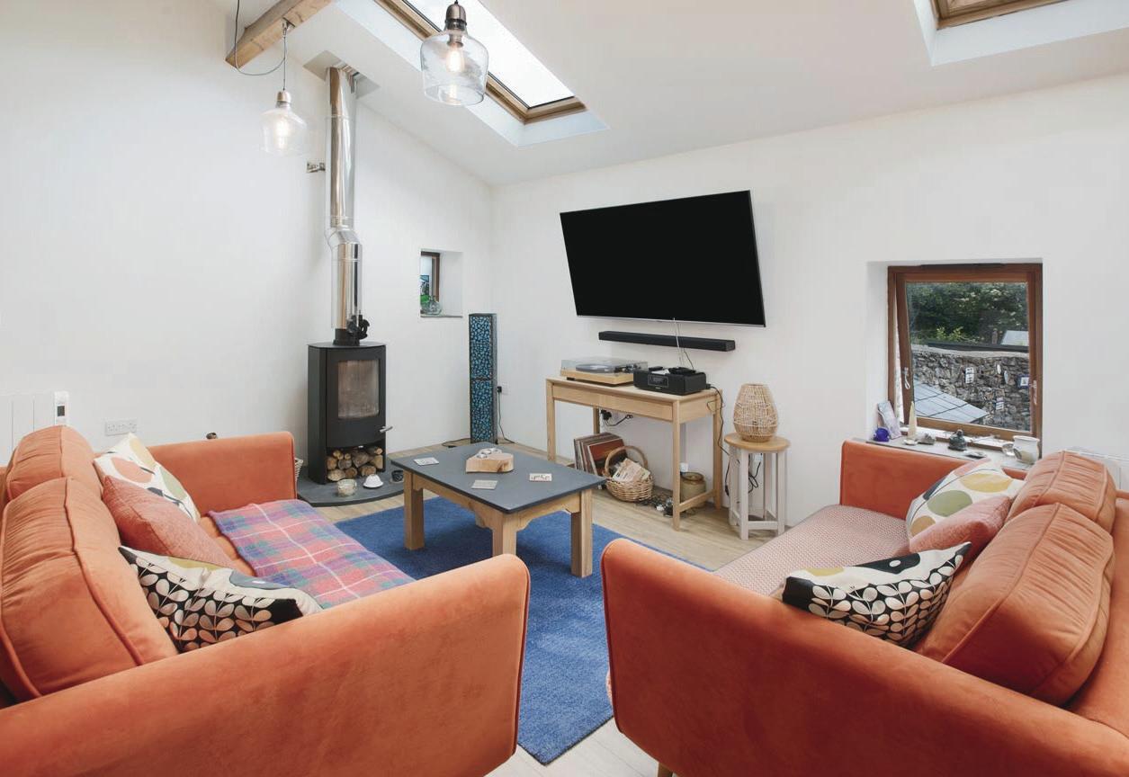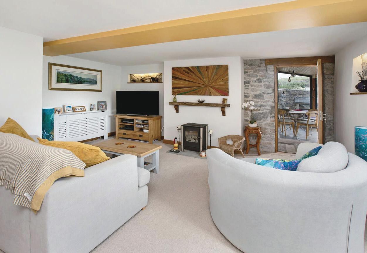 From the garden room, a few steps lead to a charming family room — a space that exudes charm and comfort. A magnificent exposed stone wall stands as a testament to the property’s history, while a log burner adds warmth and atmosphere, making this room equally inviting whether basked in daylight or lit by the gentle glow of firelight in the evening.