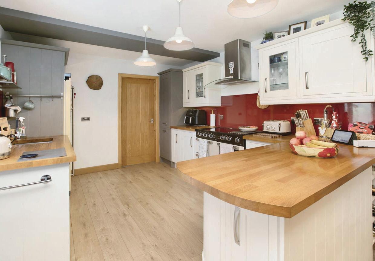 The kitchen is both charming and practical, featuring cream cabinetry paired with solid wood worktops. Integrated appliances, including a dishwasher and larder cupboard, offer sleek convenience, while a large oven and dedicated space for a fridge/freezer make the kitchen well-suited to family life and entertaining.