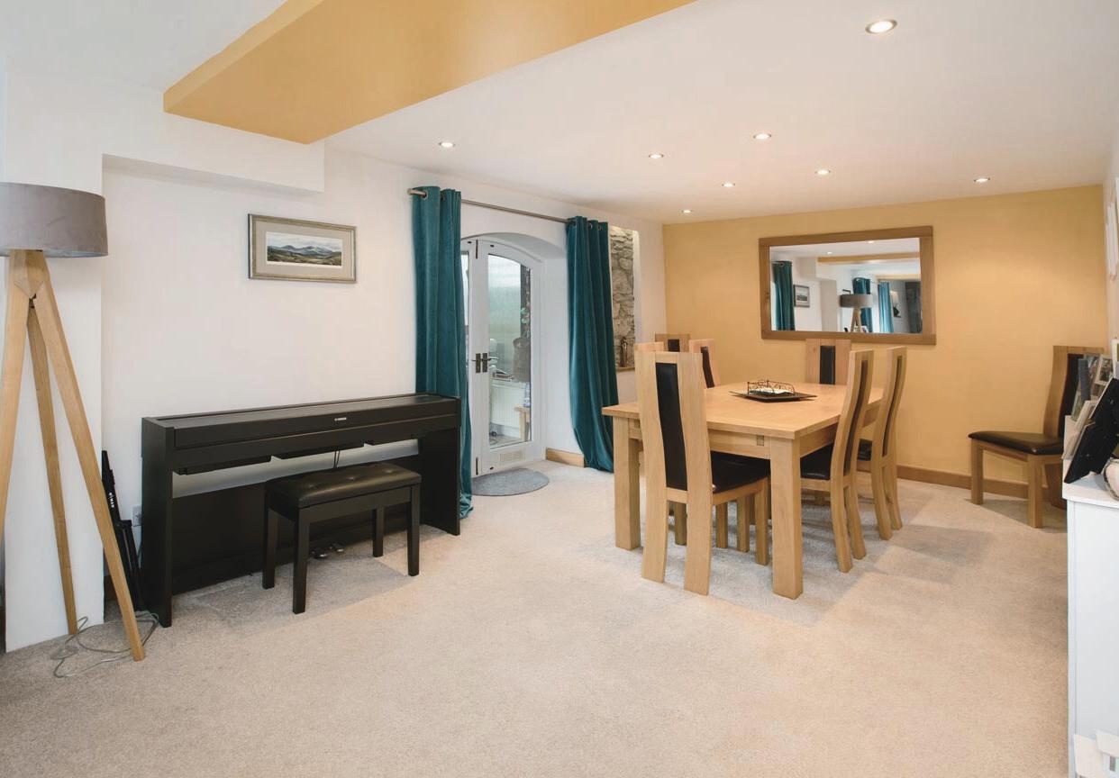 Two French doors, each crowned with arched tops and framed in exposed stone, invite natural light into the room and open directly onto the garden and conservatory, offering captivating views of the surrounding countryside. The current layout includes a formal dining area, ideal for family gatherings and entertaining, along with a cosy seating area centered around a gas fire — a welcoming focal point.