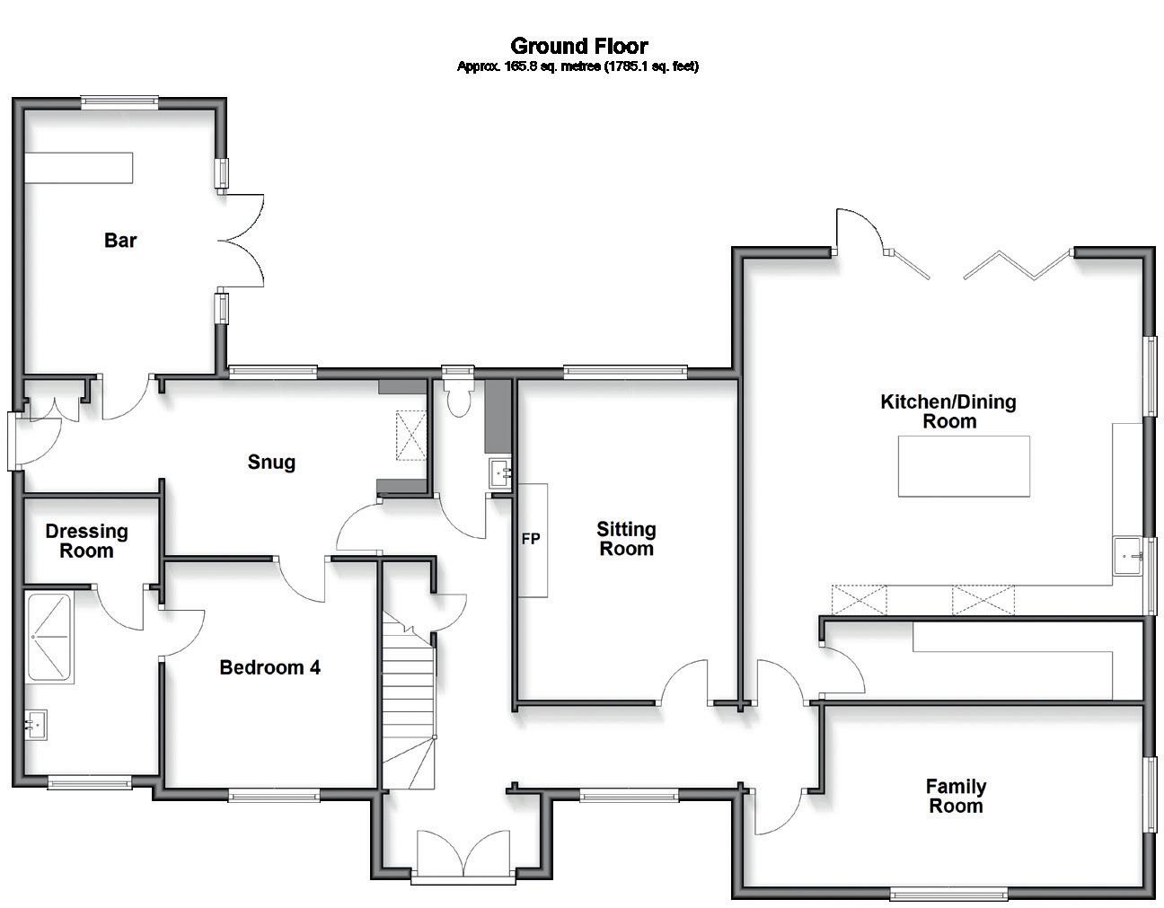 Also on the ground floor are multiple versatile living spaces, including a sitting room, family room, snug, and a stylish bar – ideal for both everyday living and entertaining. A double bedroom with en-suite and dressing room completes the ground floor, along with a cloakroom.