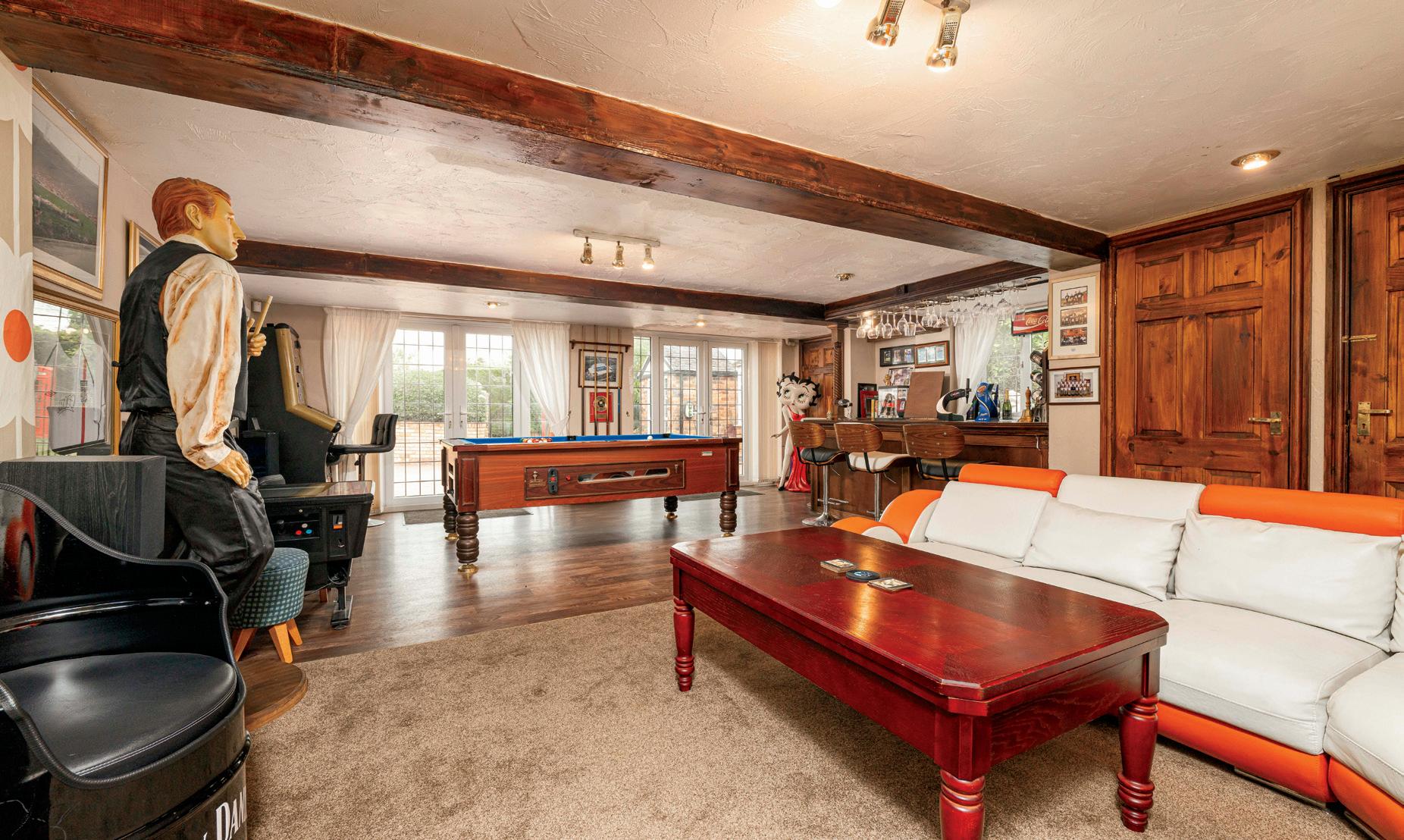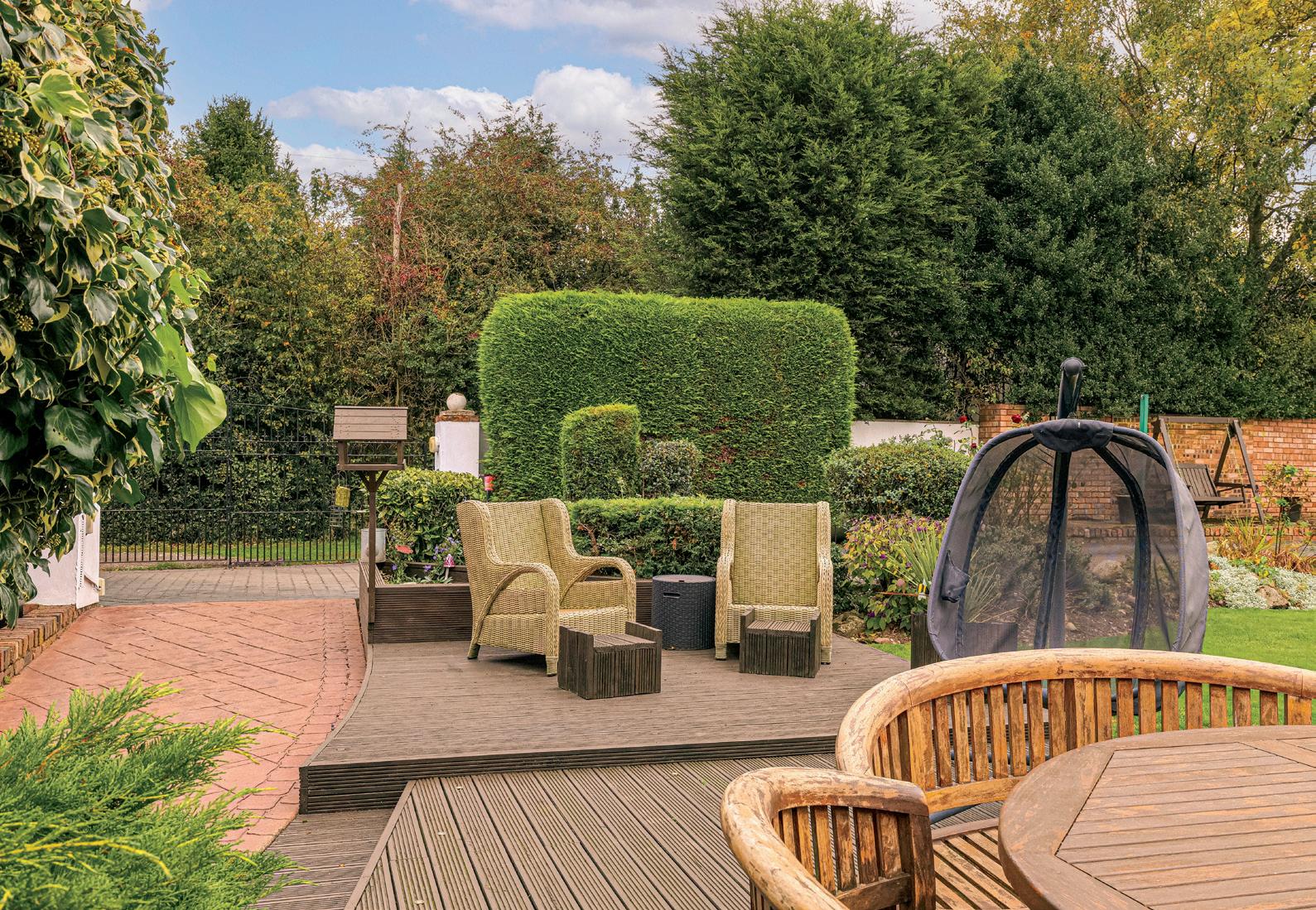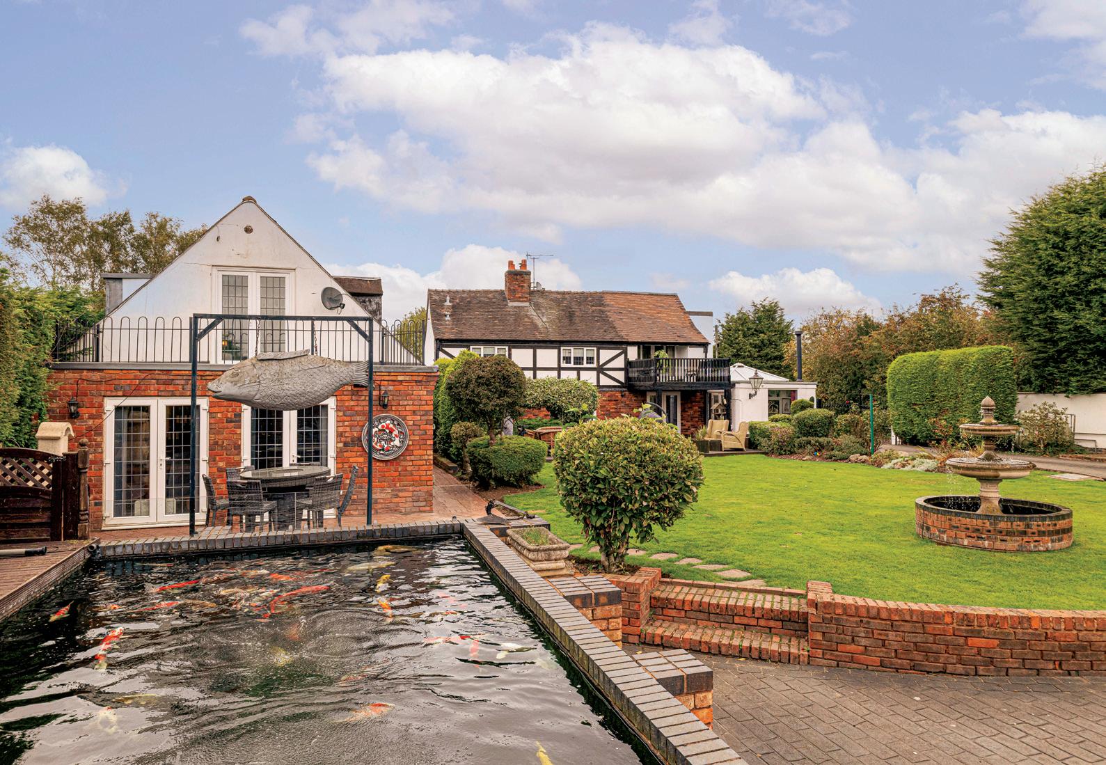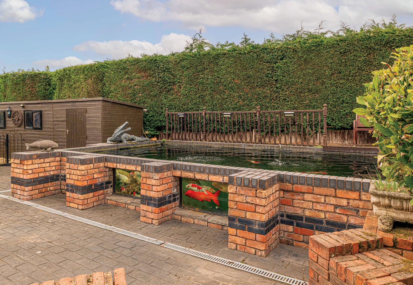 The rear garden is a true highlight, beautifully designed with a Creteprint patio, timber decking, a most impressive ornamental Koi pond, children’s play area, and even a private astroturf football pitch, perfect for family life.