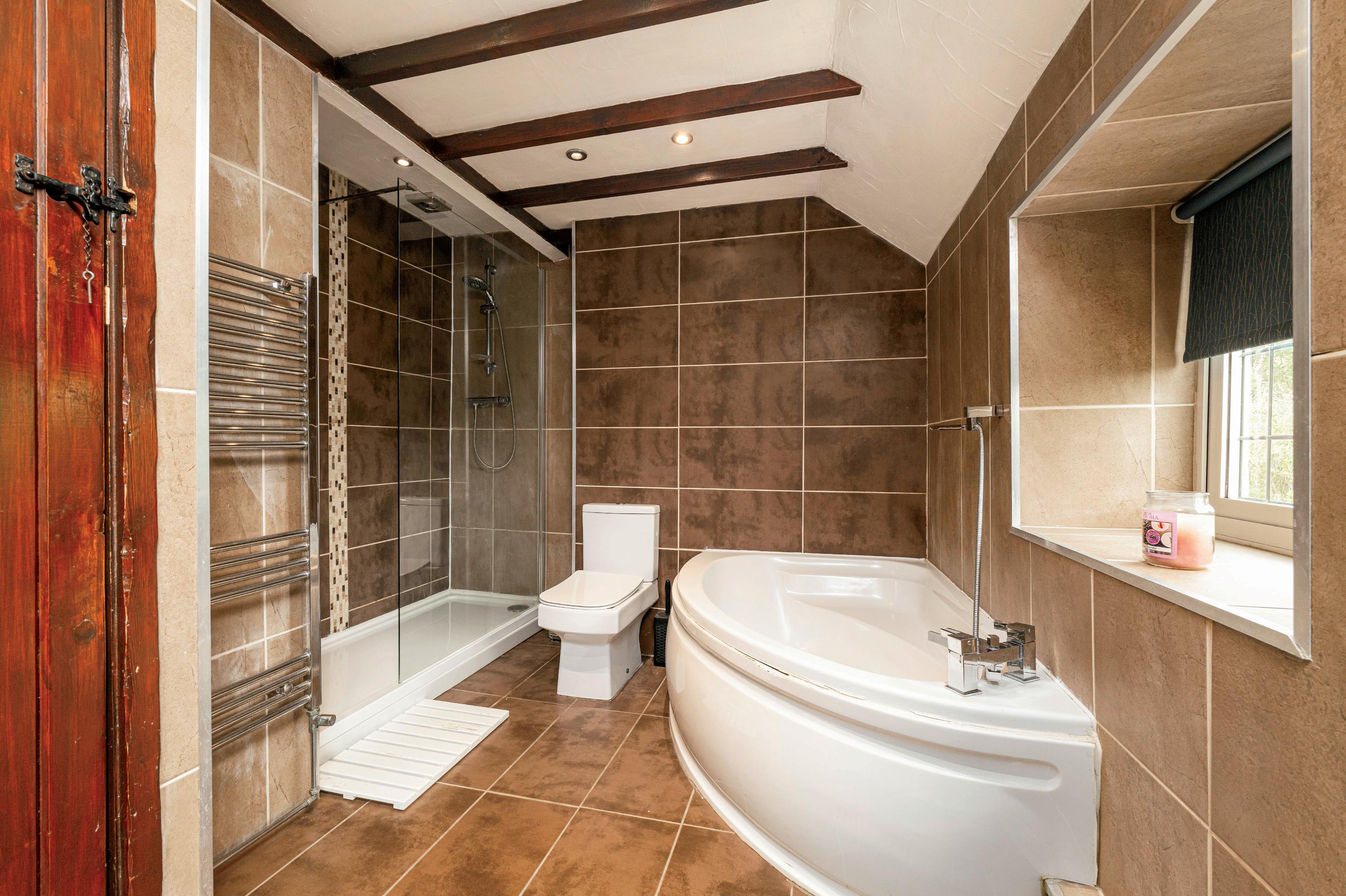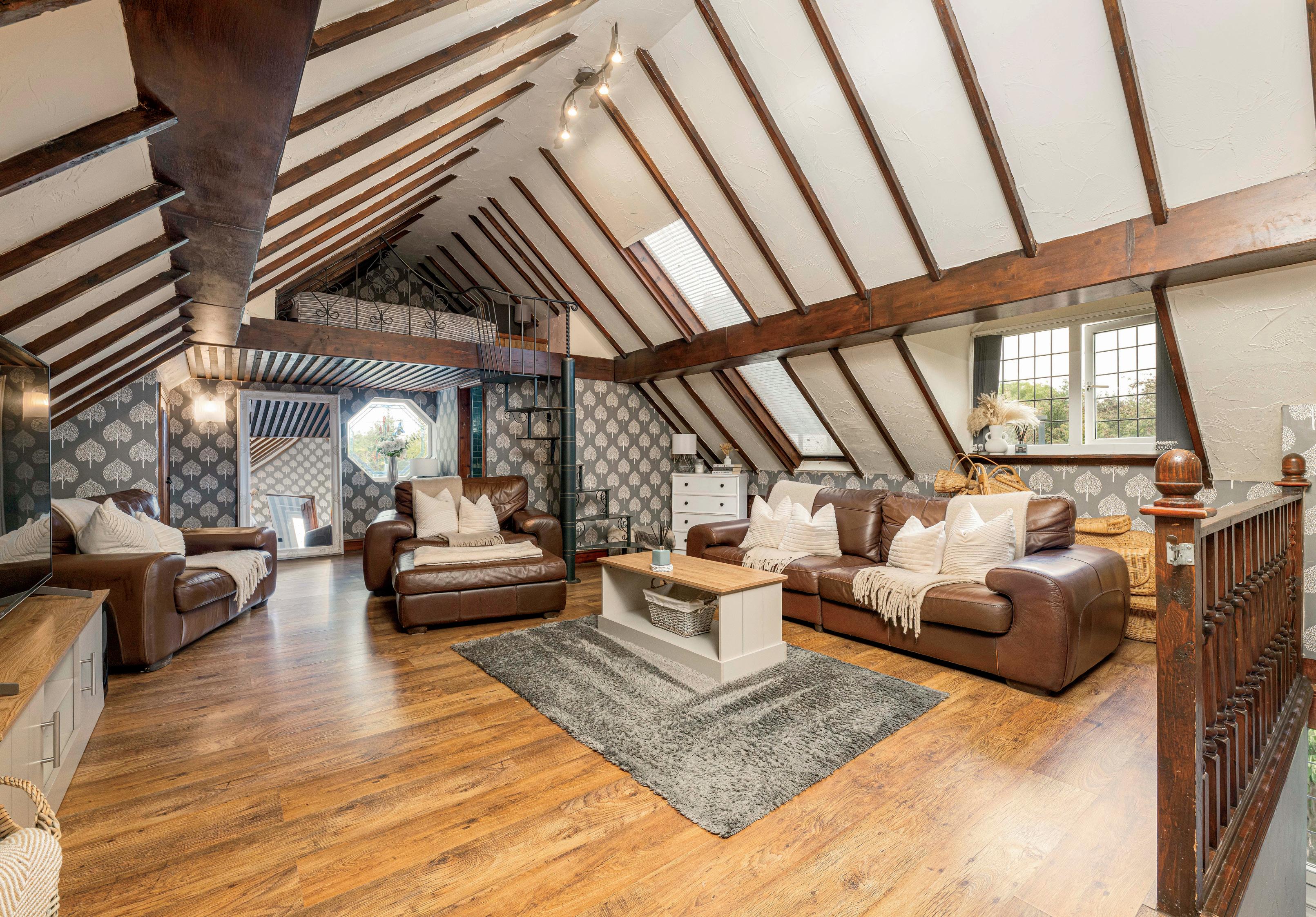 The detached annex is a superb addition, ideal for guests, extended family, or multi-generational living. To the ground floor it includes a spacious games room and bar (which could become a ground floor sitting room), a WC and a modern kitchen dining area, again, filled with character, displaying a beamed ceiling, exposed brick feature wall, flagstone flooring and two sets of French doors to the garden. To the first floor there is a versatile open-plan living room with a vaulted, beamed ceiling and mezzanine level over, in addition to a three piece bathroom and a spacious double bedroom with a balcony out to the rear of the property.