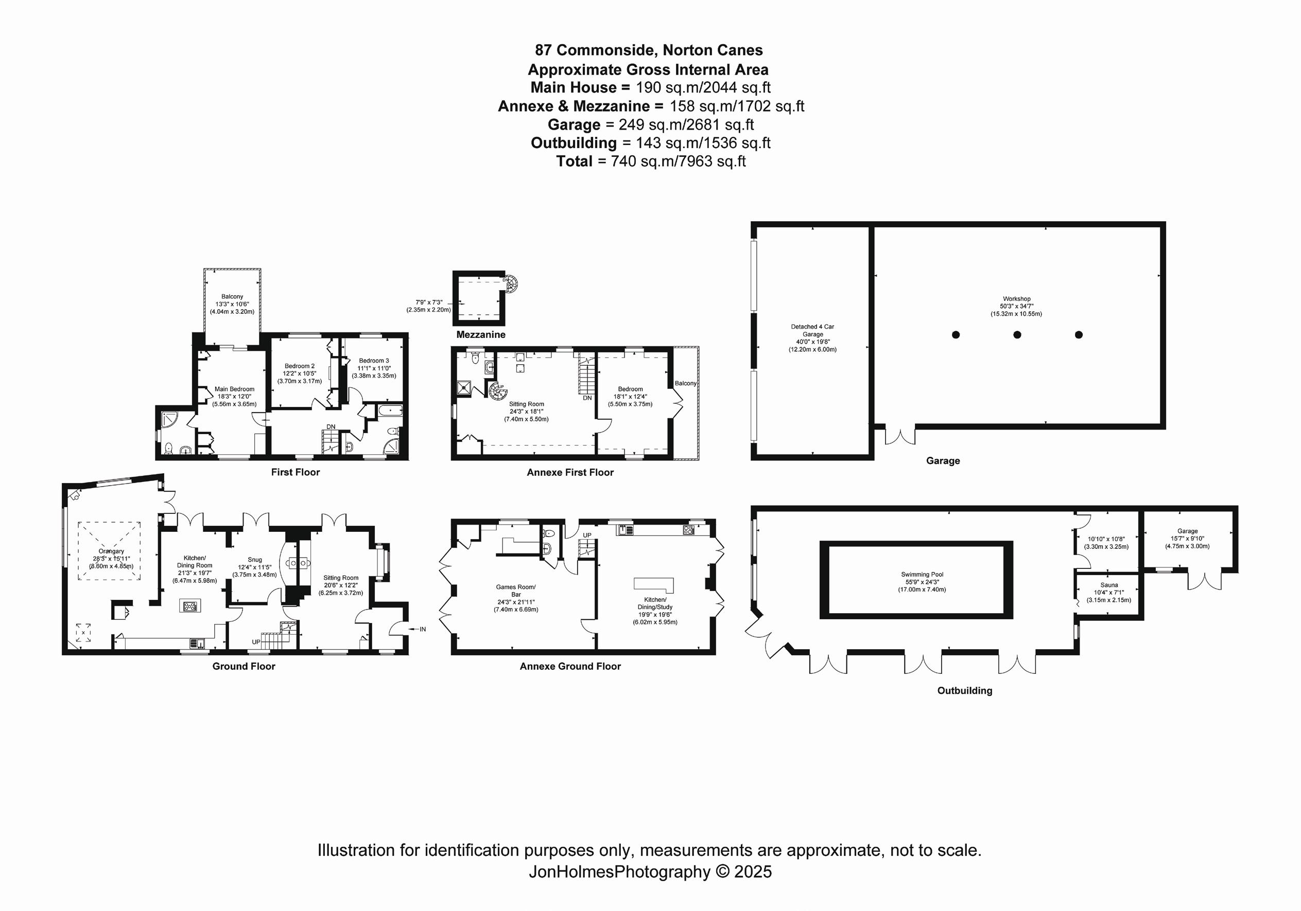 Outside, the grounds are extensive and thoughtfully landscaped. A large tarmac driveway provides ample parking and leads to a detached four-car garage, an additional single garage, and a substantial workshop/storage building.