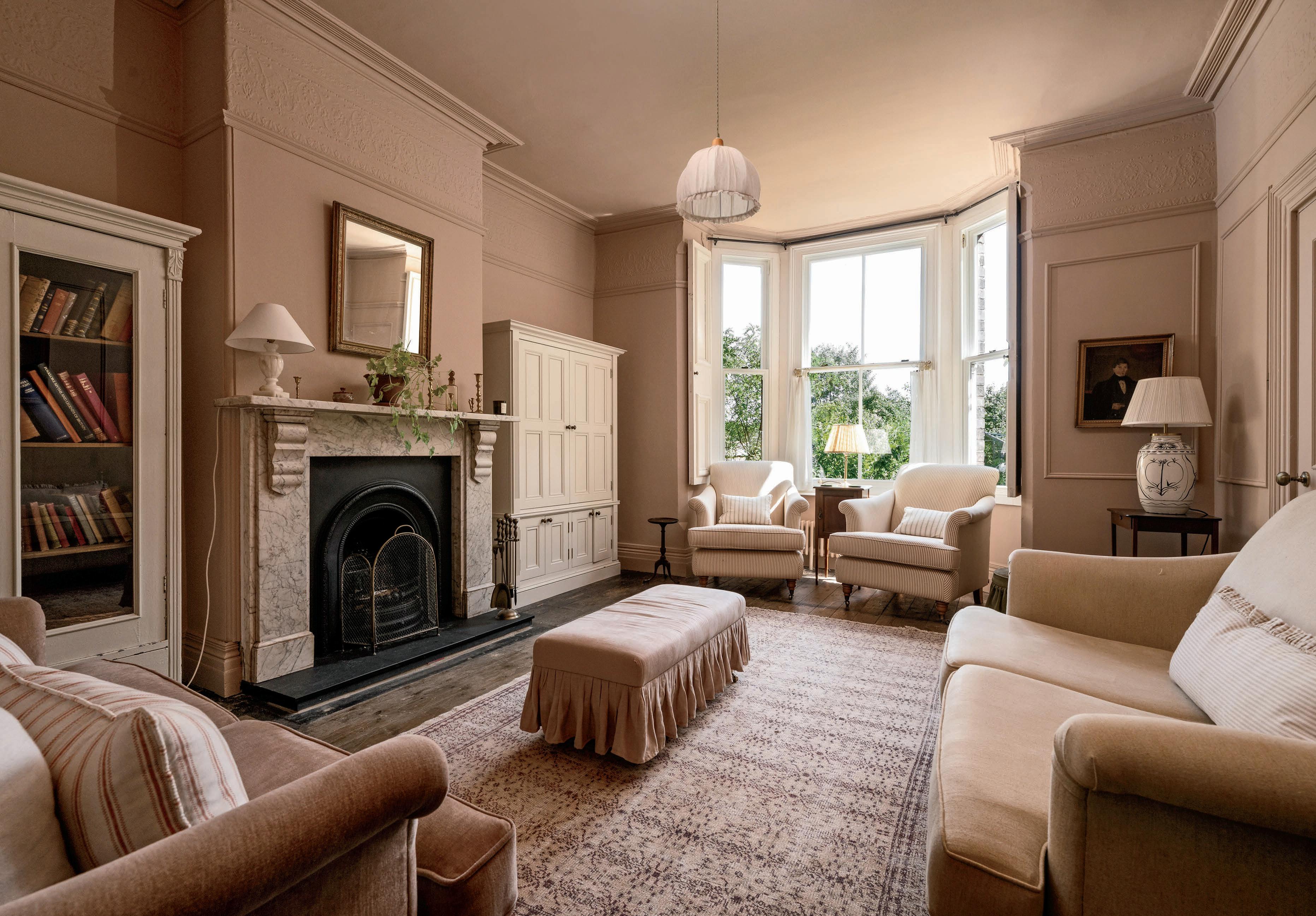 The sitting room is both gracious and inviting, centred around a working marble fireplace and framed by a charming bay window overlooking the gardens. Opposite, the living kitchen offers a perfect balance of style and functionality. Flooded with natural light, and enhanced by decorative coving and a ceiling rose, the dining space leads effortlessly into the bespoke fitted kitchen. Designed with both flair and practicality, it boasts granite work surfaces, a central island, integrated appliances, full-height storage, and a Smeg range cooker (available by separate negotiation).