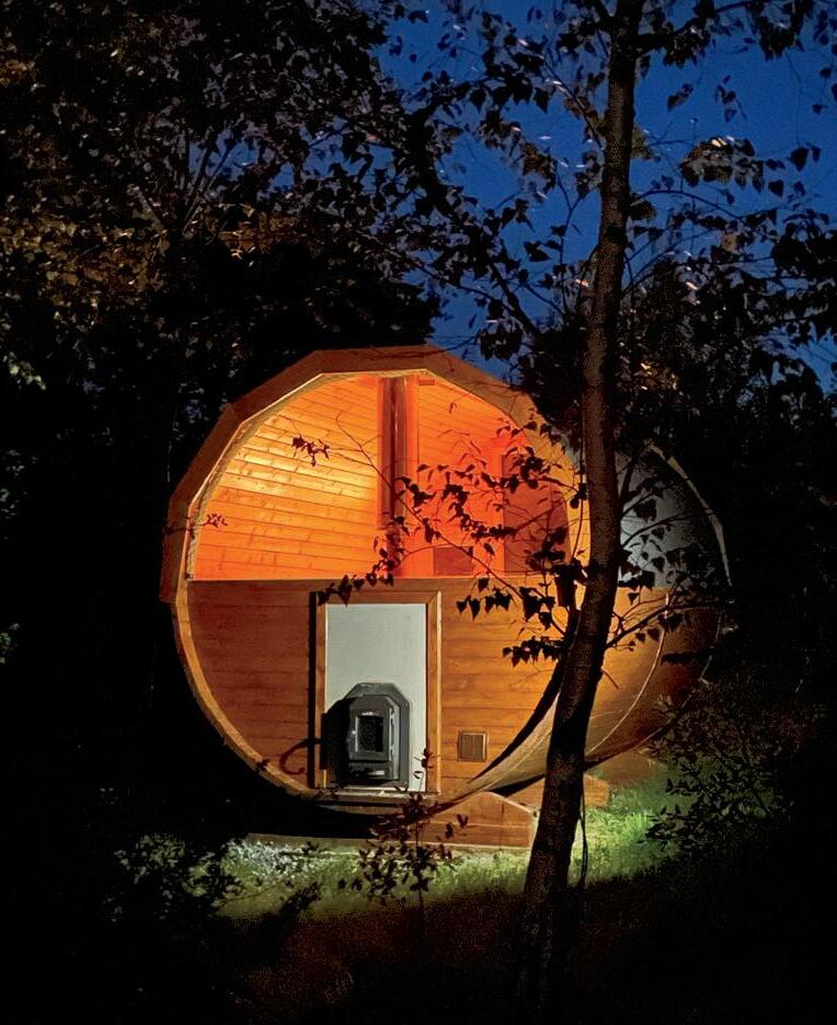 Next to the pool is a horseshoe shaped BBQ and alfresco dining area with a firepit, and steps leading up to a log heated barrel sauna. Utilities including electricity, a water pipe (to be connected), and Starlink satellite internet (located below the pool) are in place, making this the perfect spot for a future yurt or shepherd’s hut, subject to permissions.