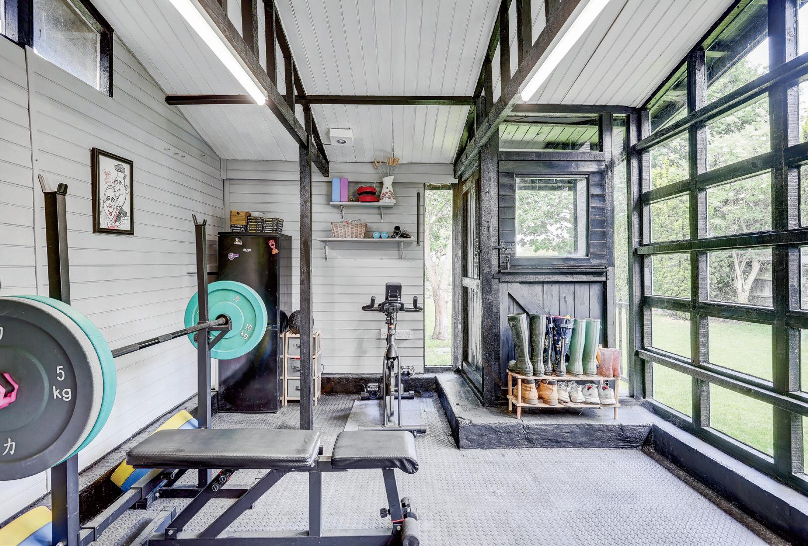 Externally, the property boasts a private driveway with ample off-road parking and a neatly maintained front garden. To the rear, a sweeping garden backs onto open fields, offering breathtaking, uninterrupted views of the surrounding countryside. This idyllic outdoor space is perfect for al fresco living and is further enhanced by a gym, a shed, and an additional outbuilding.