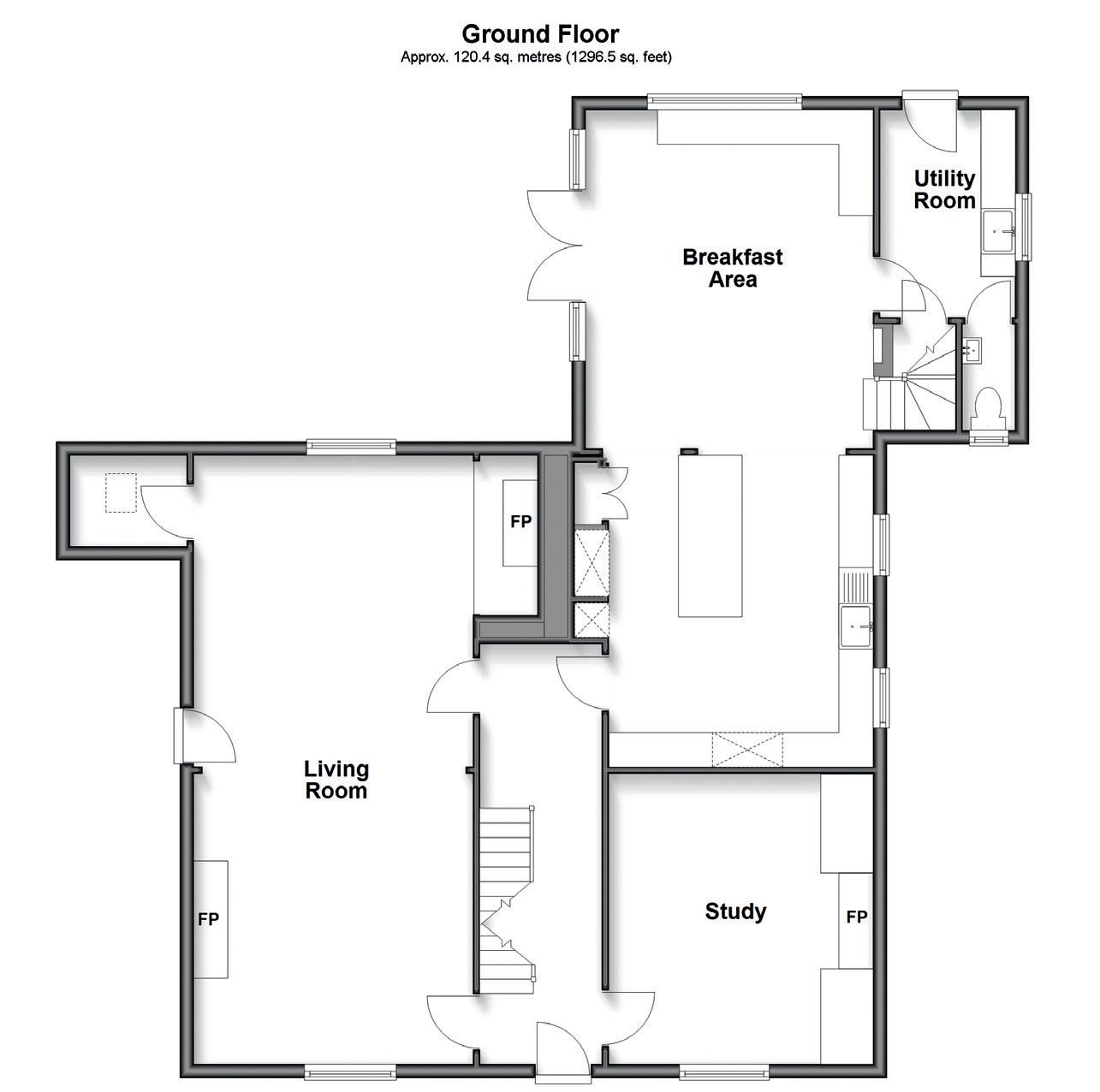 windows overlooking the garden and French doors with full height side windows opening onto a spacious terrace. It includes a built in banquette style seating on two sides and provides room for a large dining table as well as oak stairs to the principal bedroom suite . There is a door to a cloakroom and the fitted utility room that has space for laundry facilities and a stable door to the garden.