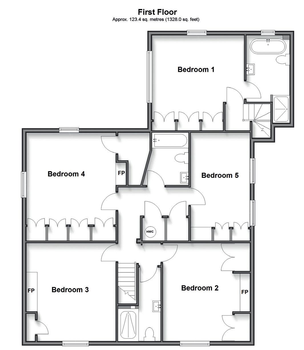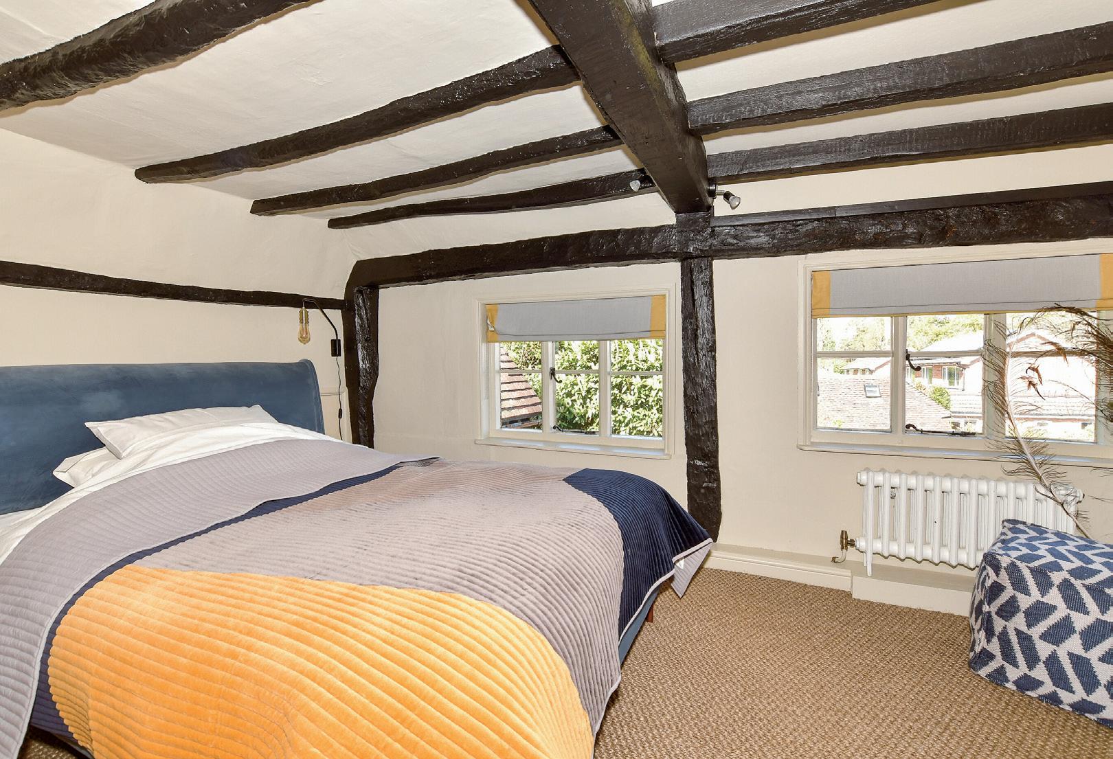 On the first floor the L-shaped landing leads to the family bathroom, a separate shower room and four double bedrooms that all have fitted cupboards while three of them also have fireplaces. The dual aspect principal suite, accessed via an oak turned staircase from the dining area, includes a vaulted ceiling fitted wardrobes and exposed beams, delightful views over the garden and an ensuite bathroom that has a standalone painted bath with claw feet and a separate shower.