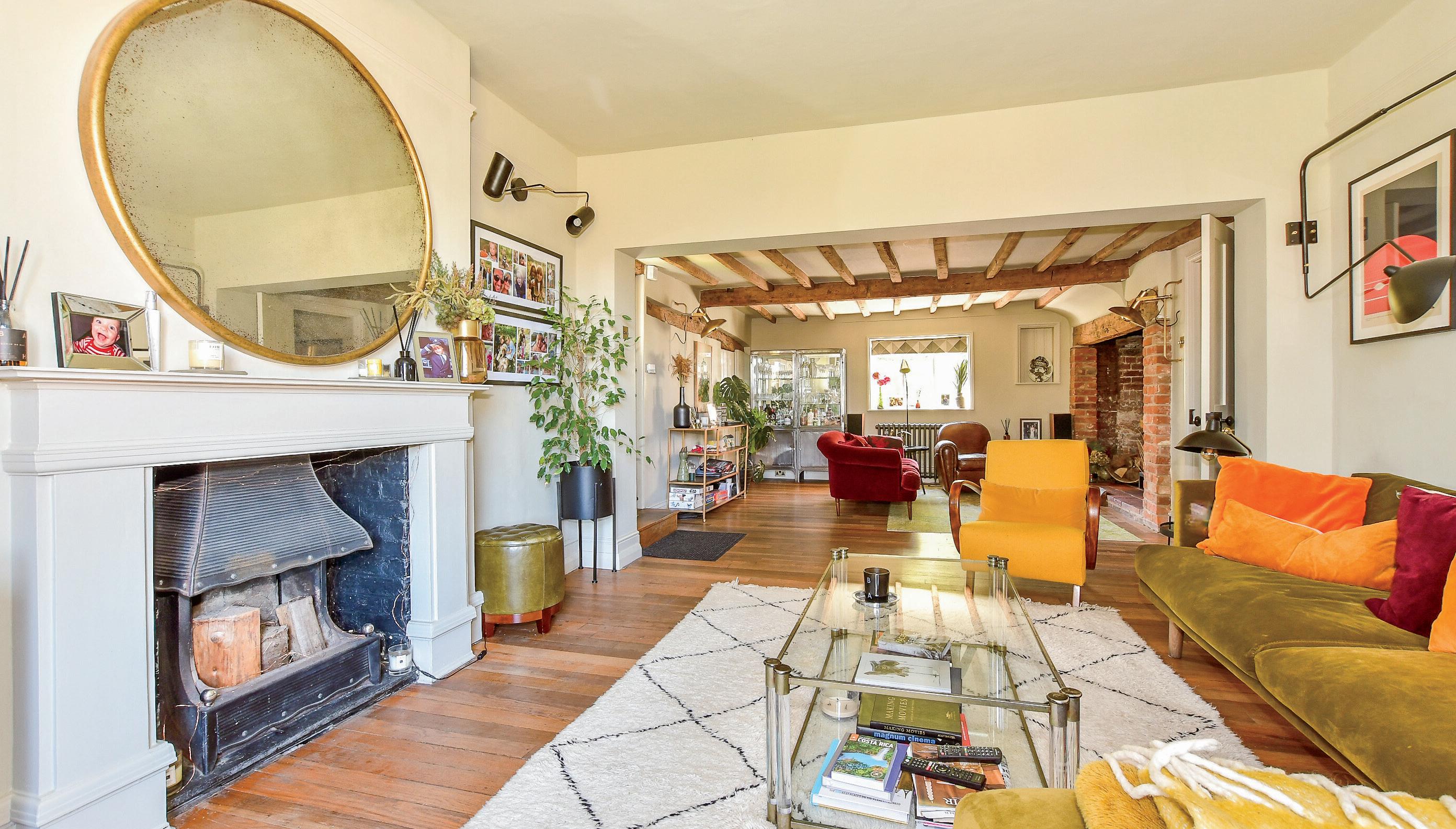 The stunning dual aspect sitting room with its beautiful oak flooring is nearly 30ft long and is really a room of two halves. There is the elegant Victorian part with a fireplace and a useful storage cupboard and the characterful cosy area in the older part of the house with exposed beams and a superb inglenook fireplace with a Bressumer beam and a log burning stove.