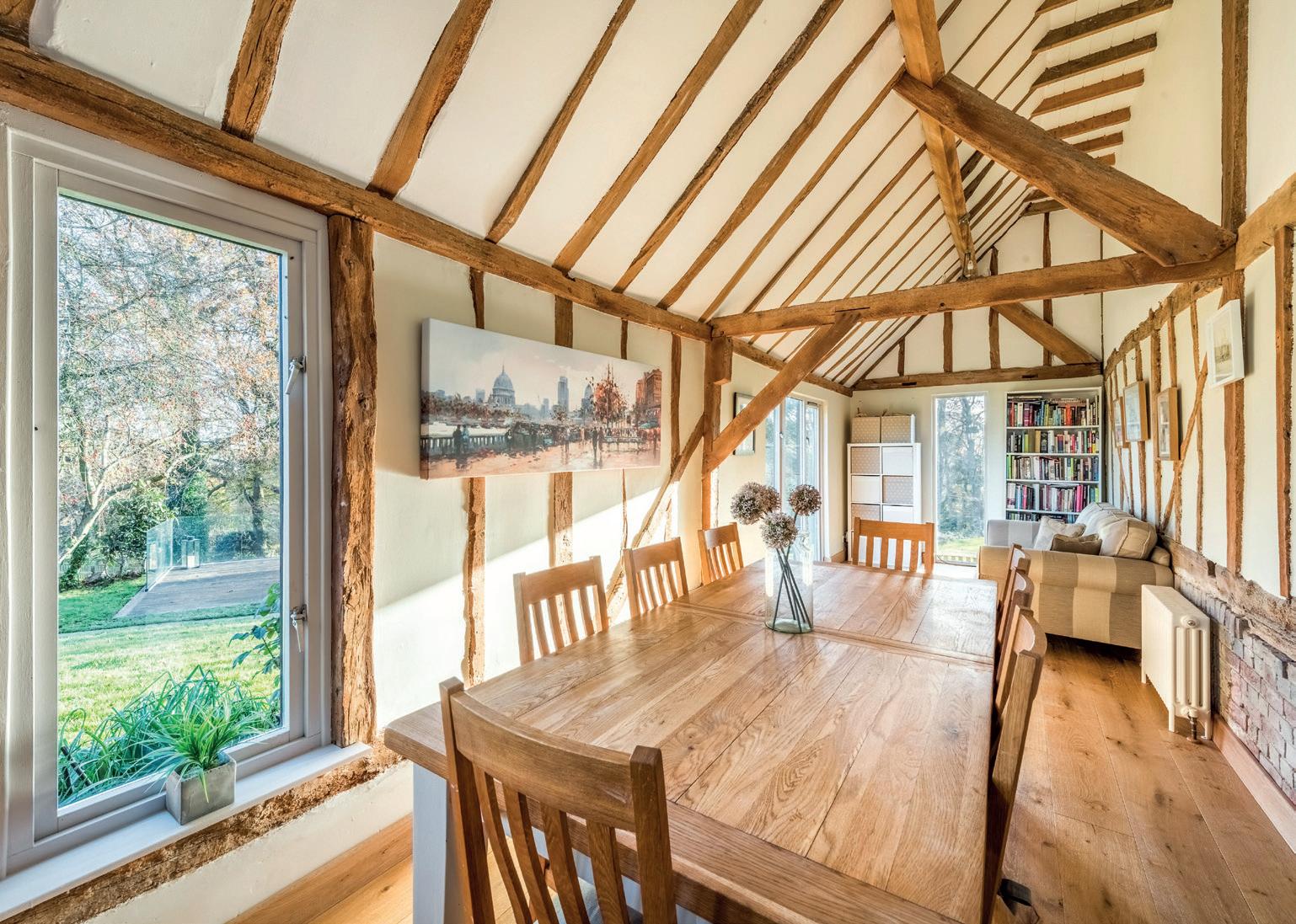 You will also find a fascinating additional seating area with a double height vaulted and beamed ceiling, French doors to the garden with double height windows and open vertical beams to the dining room/ garden room. Guests will be delighted to enjoy sitting down to a meal in this characterful room with oak flooring, a vaulted and beamed ceiling, wall beams and floor to ceiling windows providing stunning views over the garden and beyond.