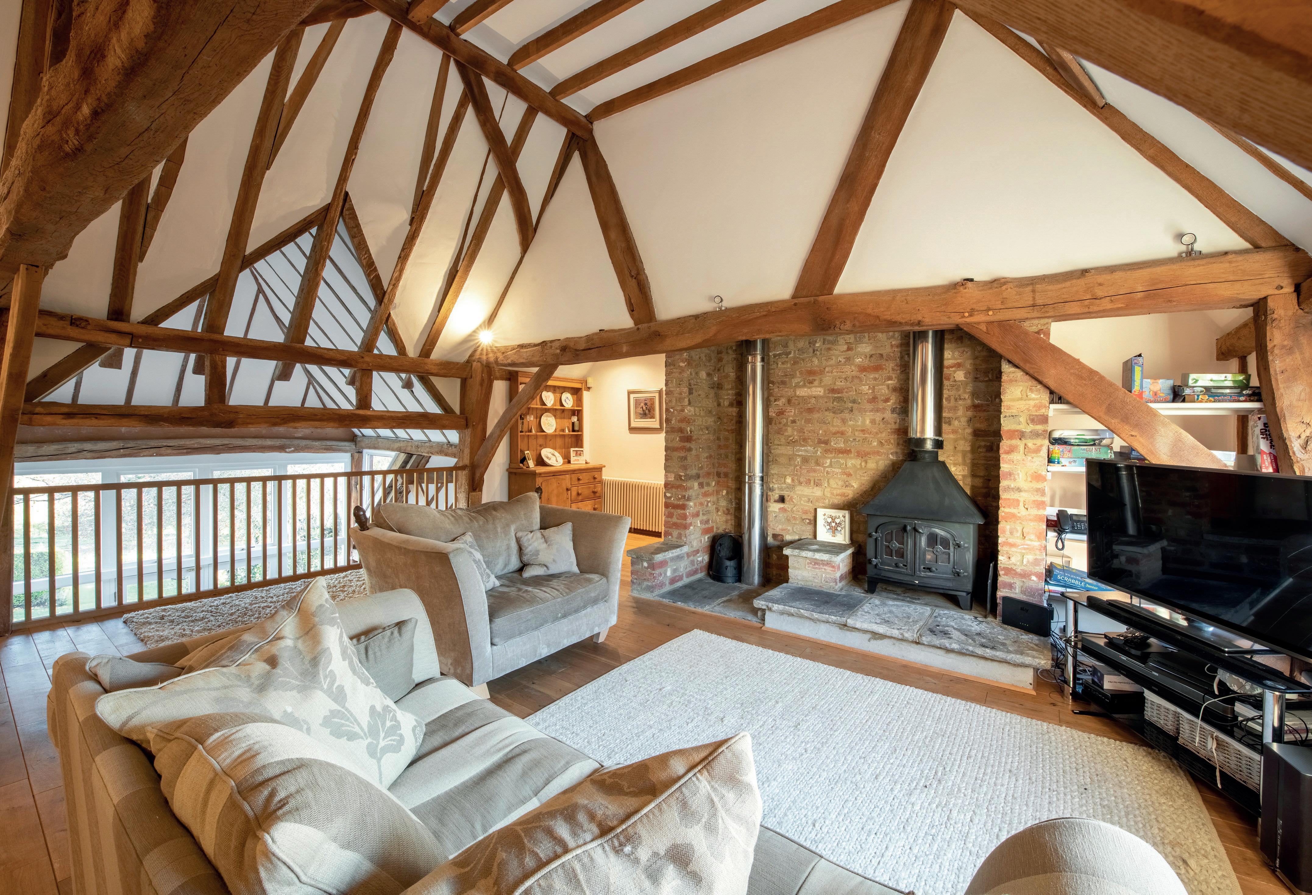 On the first floor there is the gorgeous drawing room with a vaulted and beamed ceiling, wall and cross beams, oak flooring, a wall of windows providing farreaching rural views and a balcony overlooking the vaulted seating area below. There is also an inglenook style brick fireplace with a large log burner you can cosy up to on a cool winter’s evening as well as stairs to a galleried landing on the second floor.
