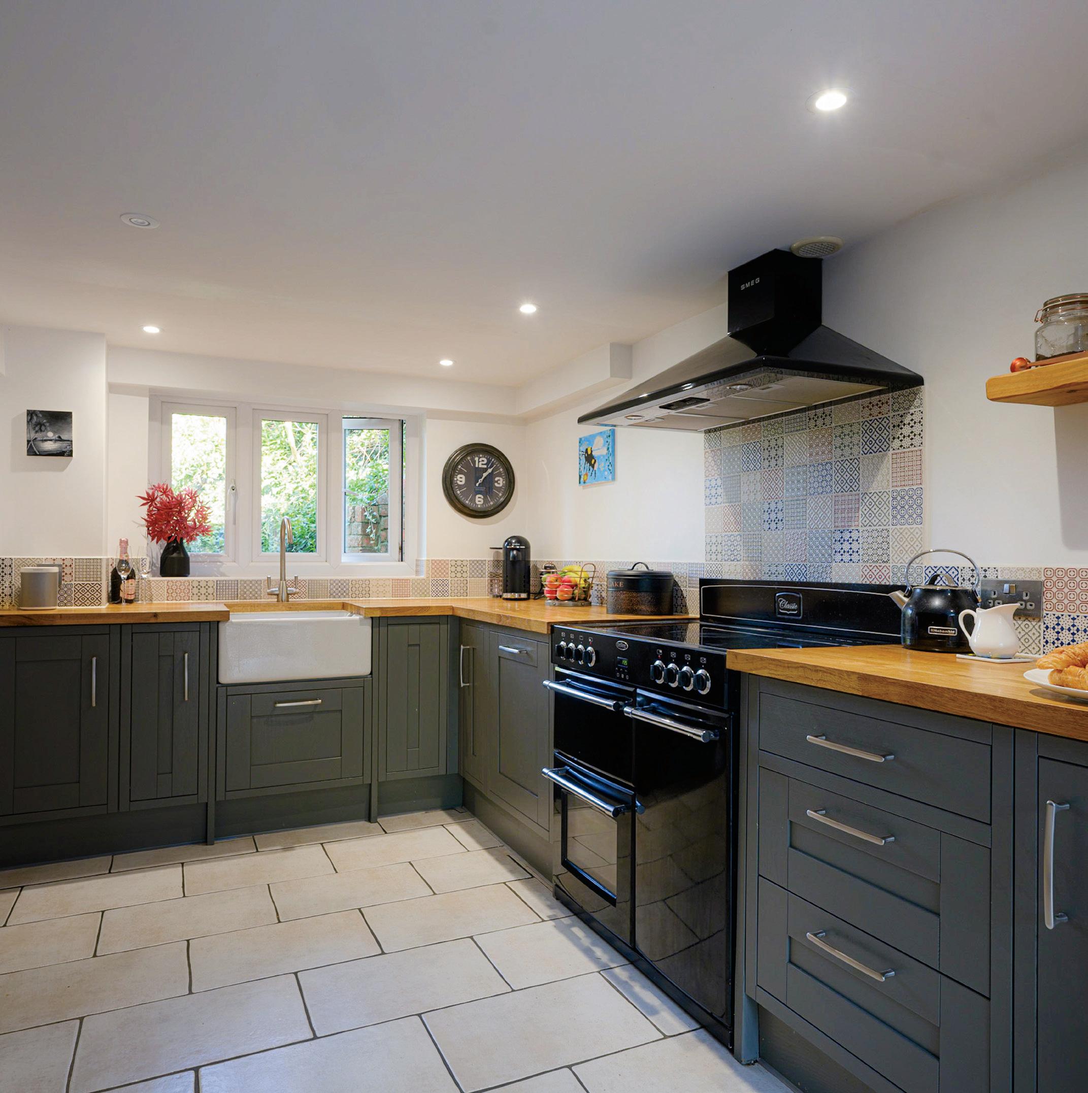 At the rear of the property, the fitted kitchen has been refitted to offer a range of useful cupboard space, an integrated dishwasher, Belfast sink, Belling range oven and space for a tall Fridge/Freezer, washing machine and tumble dryer.