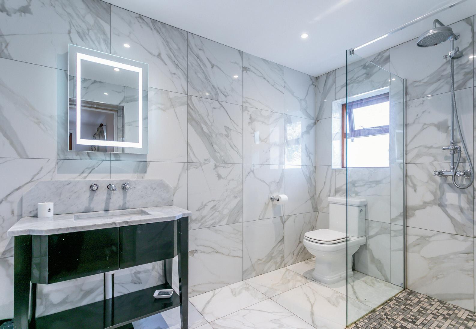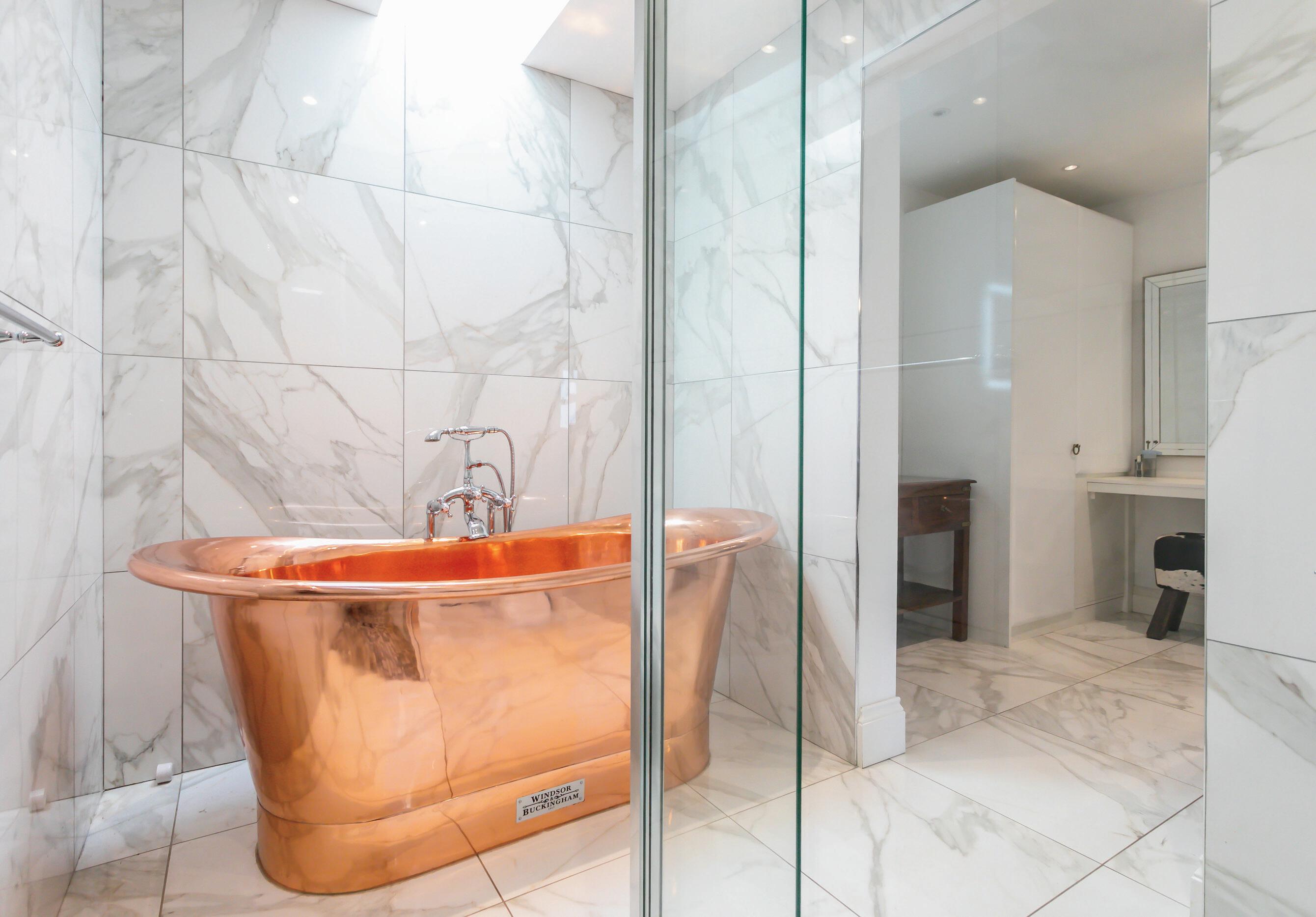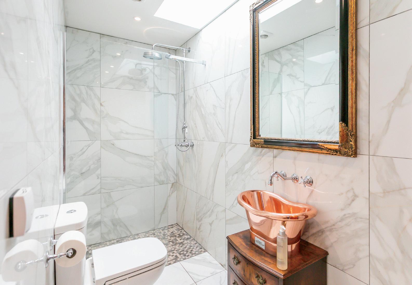 The choice of new materials and elements have also been conscious design choices; new oak flooring has been laid in the three bedrooms, marble was used to top the vanity unit in the principal ensuite, granite tops the kitchen island and garden table and the electric Aga is a 1942 reconditioned model, behind which sits an oxidized copper splash plate, itself a work of art. In the sitting room, a carved stone surround was commissioned to add an air of grandeur. The stunning copper bath from Windsor & Buckingham is also worth highlighting along with the charming matching small replica handbasin in the Jack and Jill shower room set atop an antique chest of drawers. Adding a timeless and elegant touch are the porcelain tiles which have been used on the walls and floors in the three ensuites, as well as on the floors in the dining kitchen, utility room and snug. The smallest detail has been well considered, even down to the antique copper look sockets, switches and ceiling light/fans.