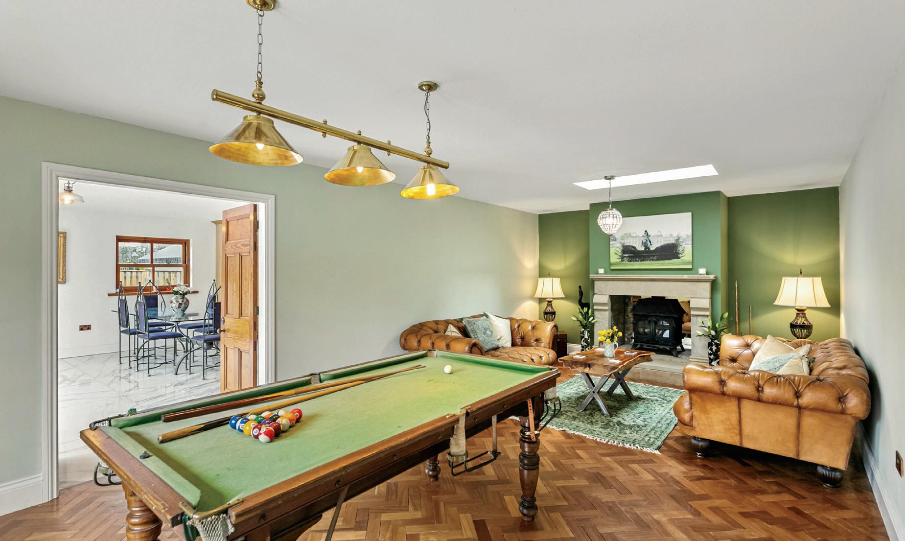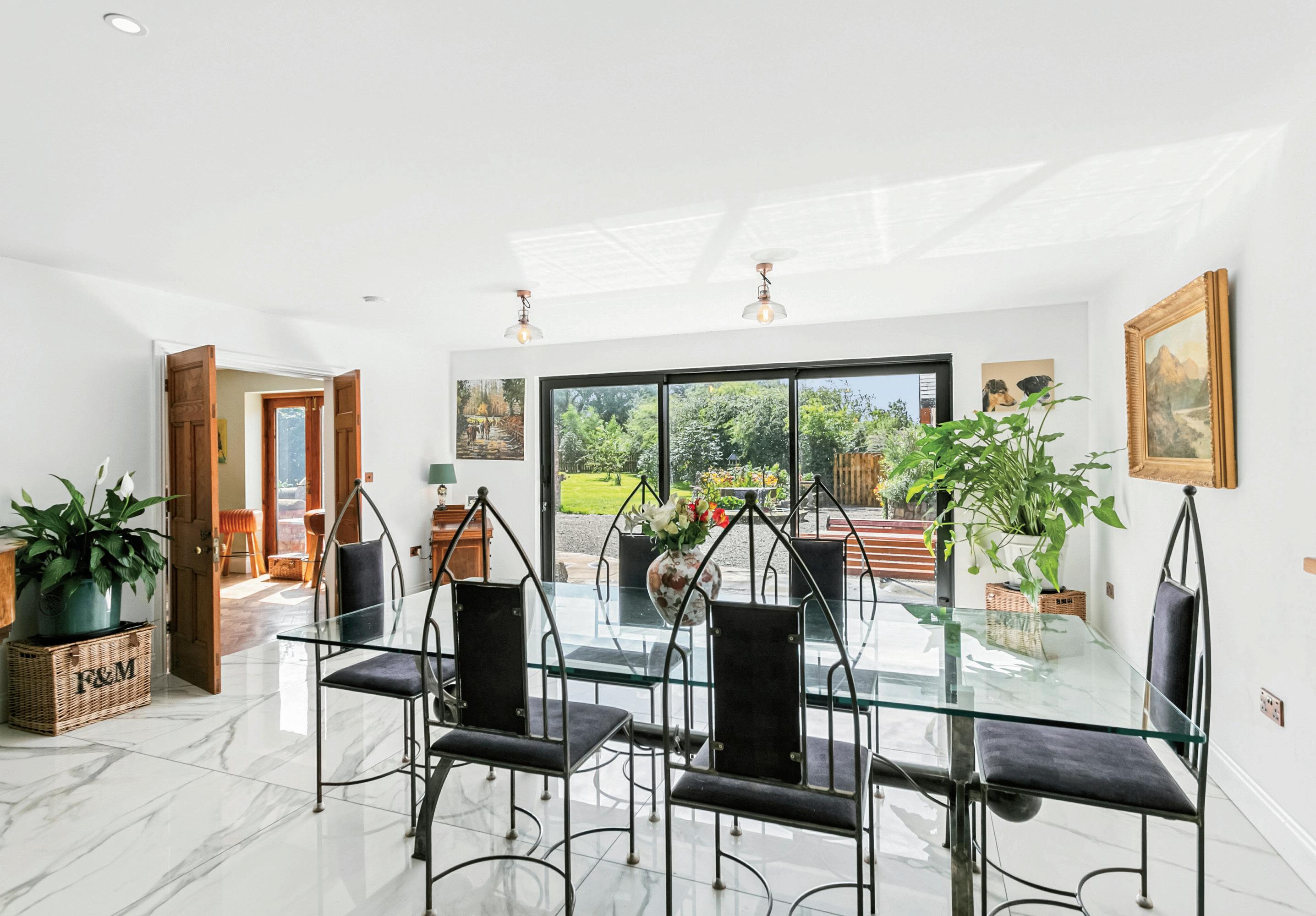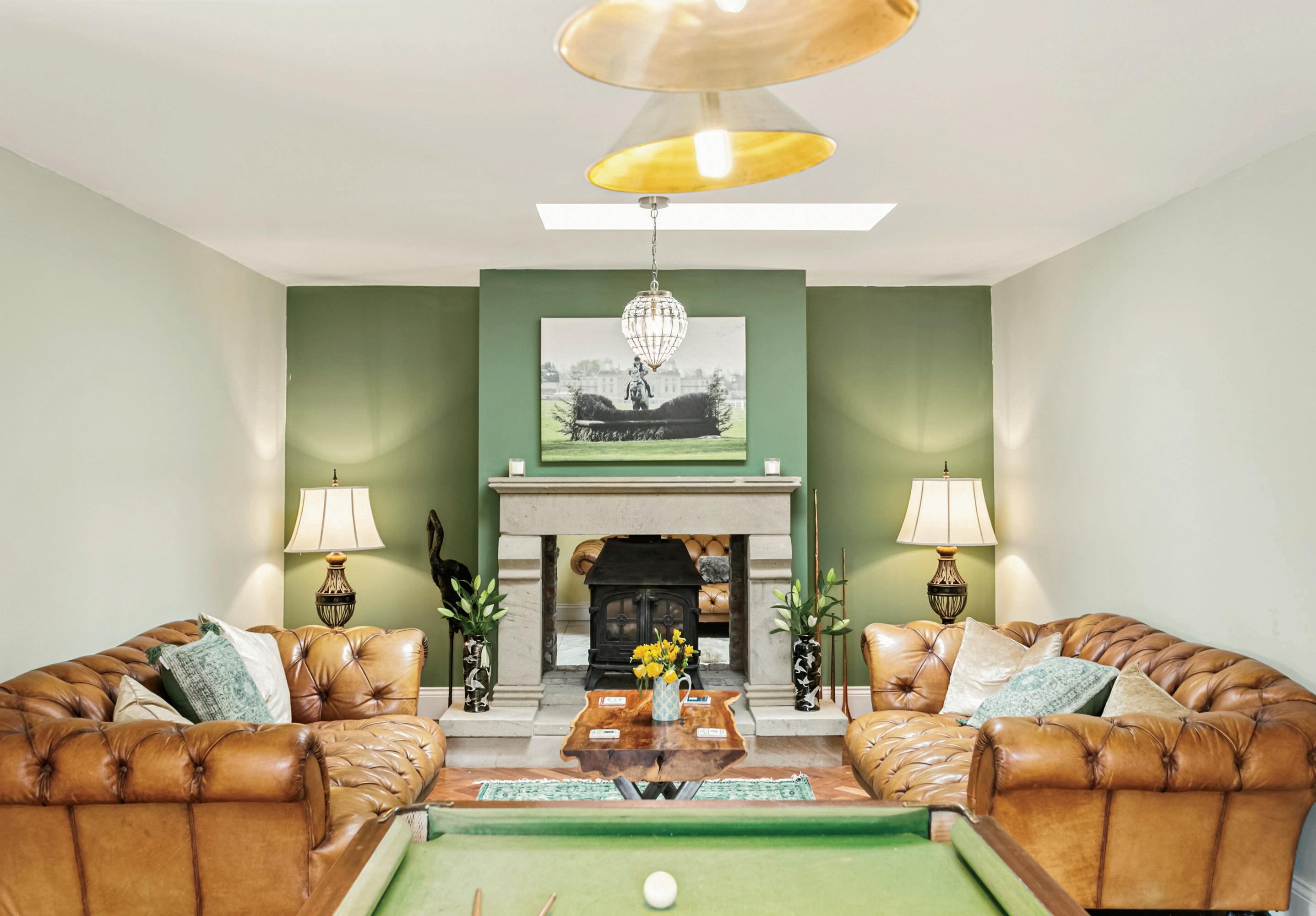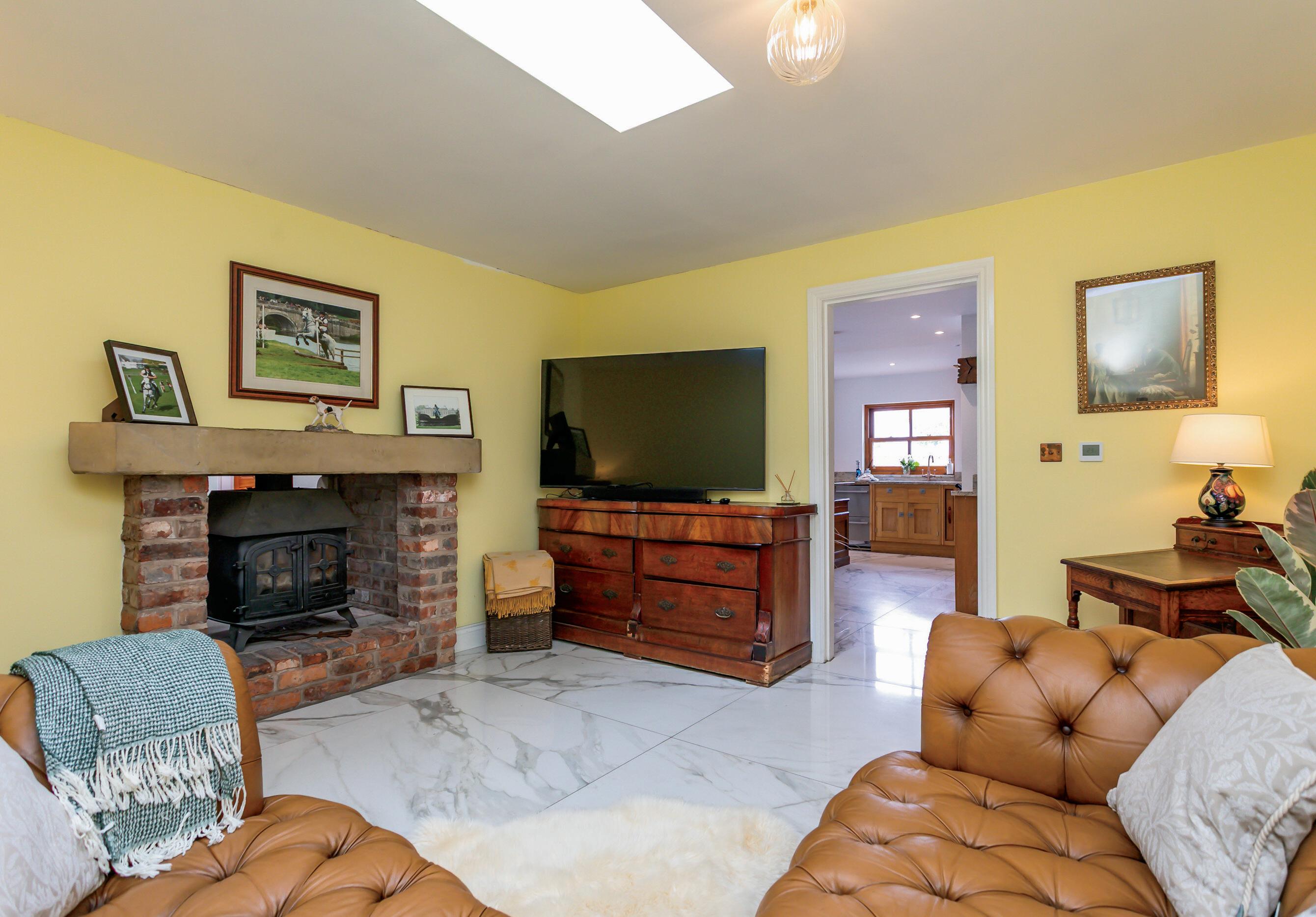 The dining kitchen is vast, light and bright. A great room for everyday family living that also really lends itself to entertaining. Sliding doors open to the main flagged seating terrace. A doorless opening leads into the snug, lovely for hunkering down around the fire and watching the TV whilst staying connected with activity in the kitchen. The main sitting room is a great room for entertaining, it’s well-proportioned and has French doors out to the main terrace.