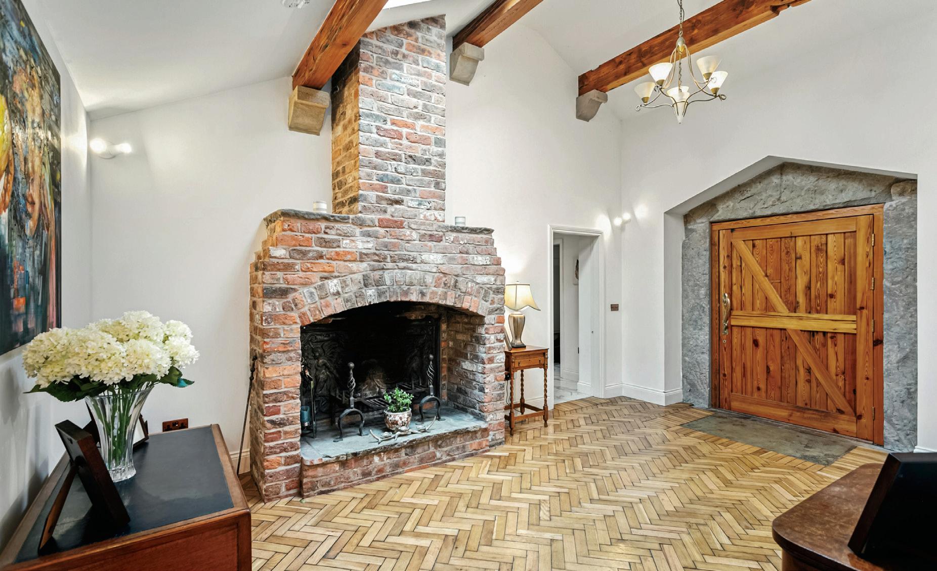 Internal pitch pine doors came from a Victorian Southport chapel as did the tall cassock cupboard which now stands in the reception hall. The lintel over the front door was originally part of an old workhouse with the stone jambs either side sourced from an old railway bridge. Supporting the roofing purlins in the hall are stone corbels, reclaimed where possible, made to match when there weren’t enough. Peek into the hall fireplace, the backplate is French and dates back to the 1600s, another intriguing find. The English oak parquet flooring in the hall was reclaimed as was the sapele hardwood parquet flooring in the sitting room which was tracked down from a closing Lakeland college.