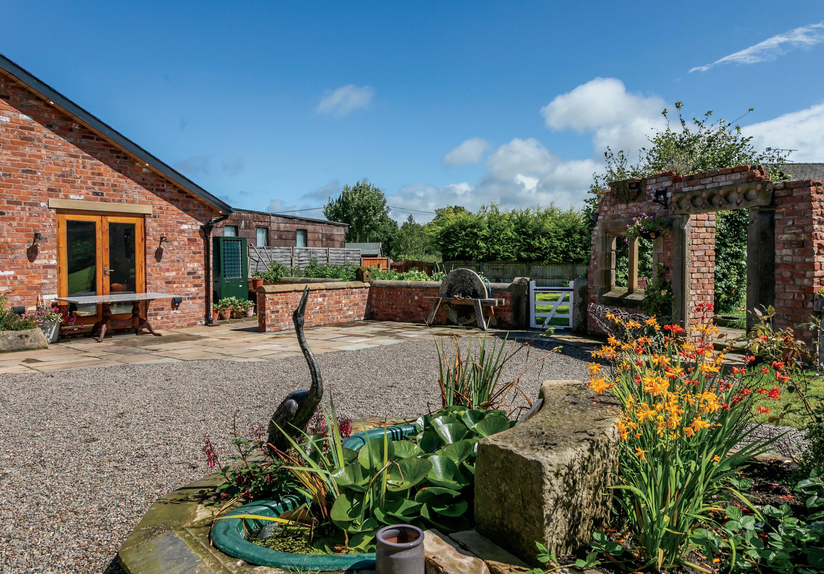 Outside, the landscaped grounds also echo the property’s blend of eras and is home to more reclaimed architectural finds; large stone flags on the seating terrace on which sits a substantial stone trough, a commemorative 1953 coronation cast iron rainwater hopper which has been repurposed as a garden planter and many structural elements of the garden folly.