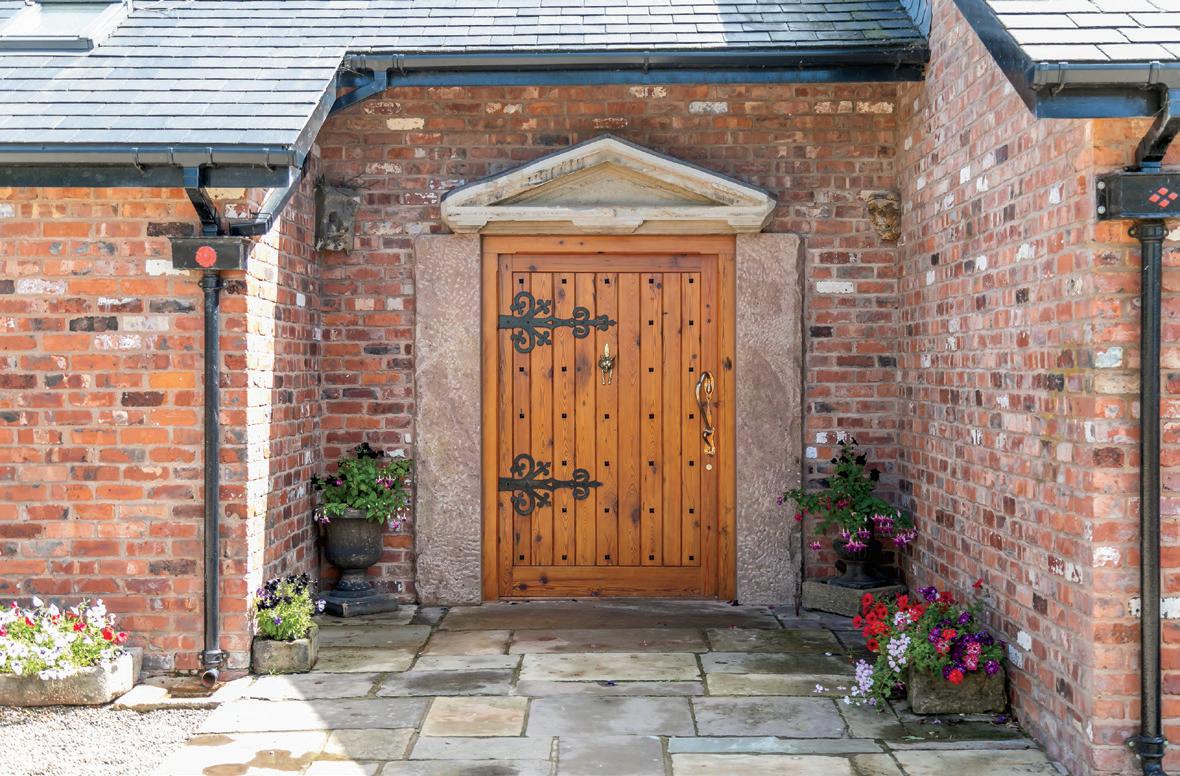 The snug and the sitting room share a double sided wood burning stove, on the snug side, the stone lintel above the stove is said to have come from Whalley Abbey as was some of the stone work used in the creation of the garden folly. Within the kitchen, the oak fronted Smallbone cabinets were sourced from Rehome, ensuring both style and sustainability. Another unique feature of the kitchen is the base of the island unit, look carefully and you’ll see it’s a double-sided partner’s desk, the space between the pedestals currently creating a quiet place for the owners’ dog’s bed! The original stables which stood on this site have also played a part in the new construction; pitch pine beams have been repurposed into window frames and the impressive front door.