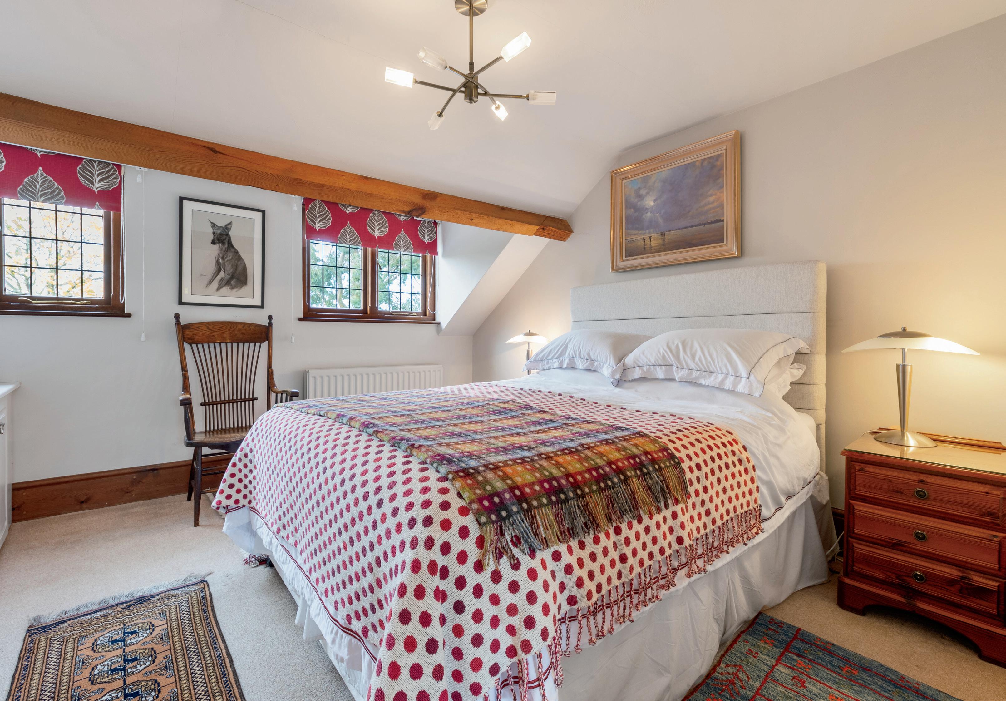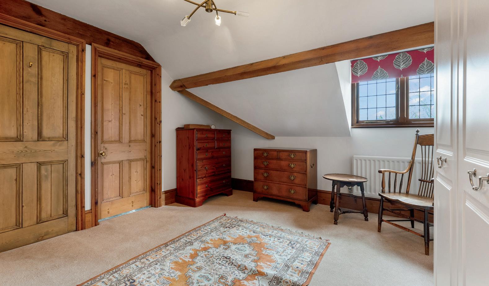Upstairs the principal suite is an indulgent private haven. Once two rooms it now offers a luxurious sense of scale with dual-aspect countryside views a bespoke dressing area and a beautifully appointed ensuite shower room.