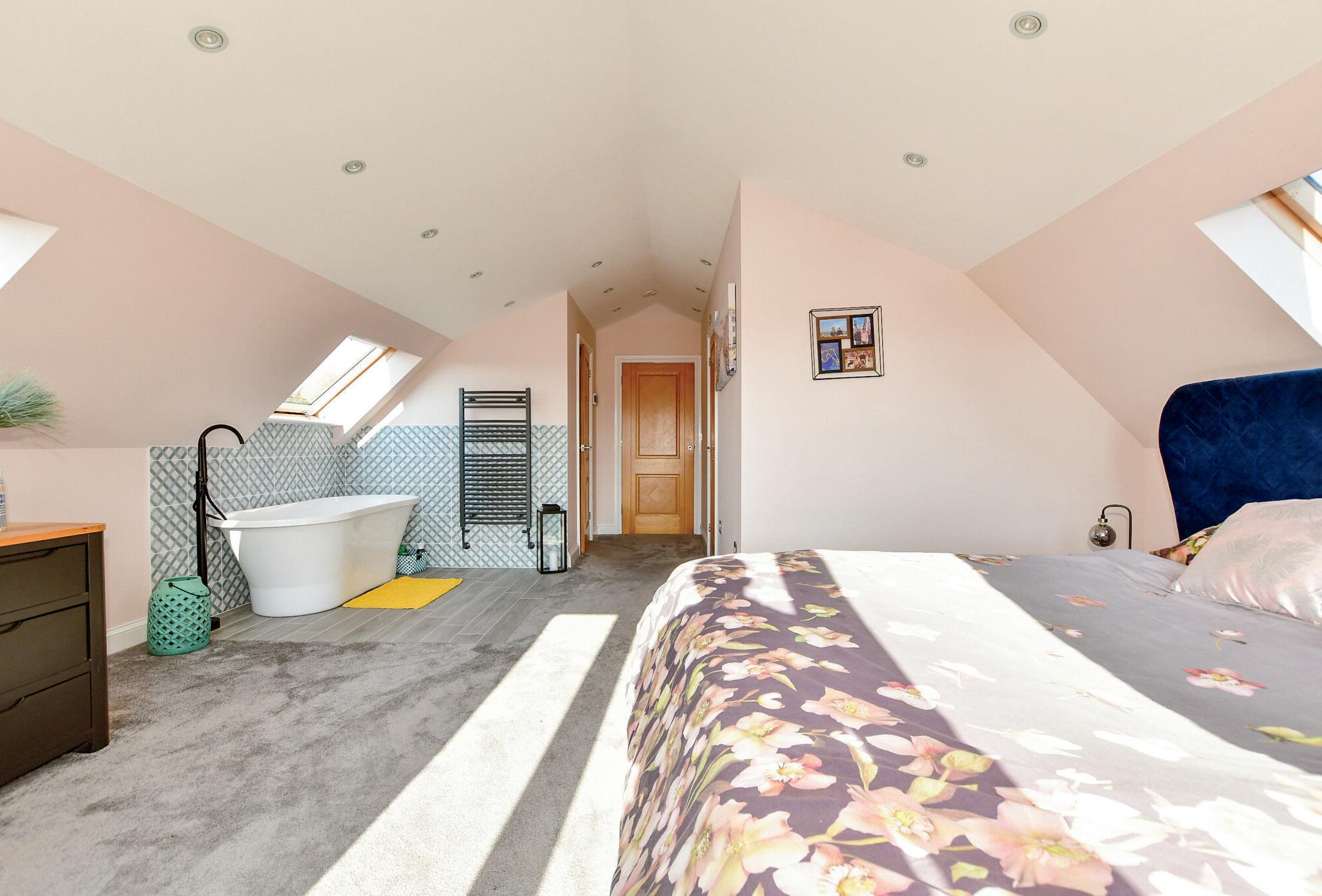 On the first floor there is a very useful utility room with built in laundry facilities as well as three double bedrooms. Two of them have en suite showers including a very large room with bi-fold doors and a Juliette balcony as well as a walk-in clothes storage area and a guest double with a large en suite bathroom with a bath and separate shower and views across to the sea. While on the second floor the magnificent first bedroom is awe inspiring. There is a spacious galleried landing that makes an ideal spot to put your gym equipment for that morning exercise routine or it could be a small office. There is a large dual aspect bedroom with a partially vaulted ceiling and Velux windows, a trendy stand-alone bath and three bi-fold doors to a secluded balcony where you can enjoy a bit of sunbathing and the panoramic sea views as well as a walk-in wardrobe and a contemporary en suite double shower with twin vanity basins.