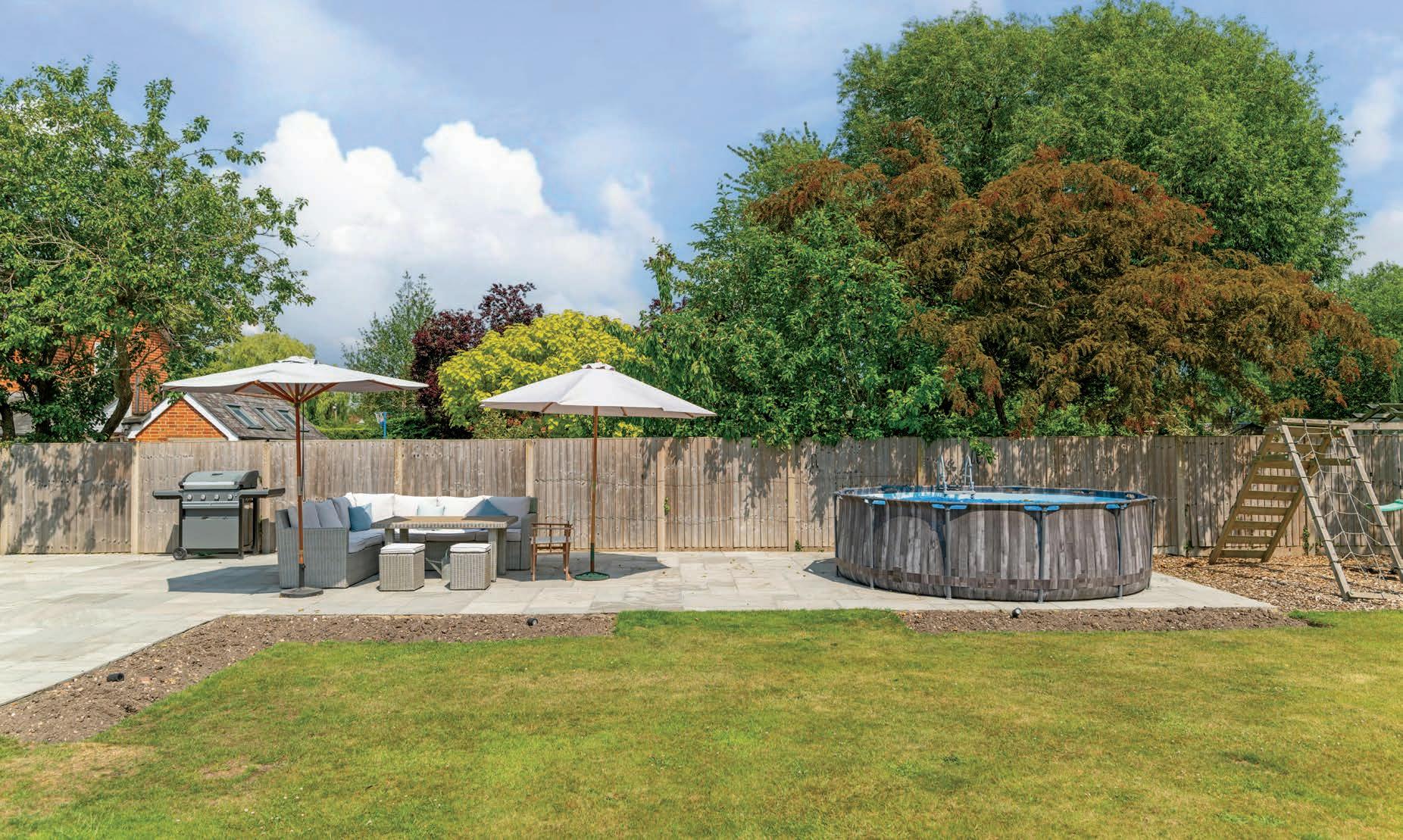Outside, the gardens have been thoughtfully landscaped to create distinct zones for both relaxation and play. A generous patio runs the full width of the property and down one side, offering ample space for al fresco dining and entertaining. The expansive lawn, dotted with mature specimen trees, leads to a hidden nature garden—an enchanting wild space accessed via a gate. A charming timber summer house with its own patio, perfect for barbecues or quiet escapes seats neatly at the end of the garden.