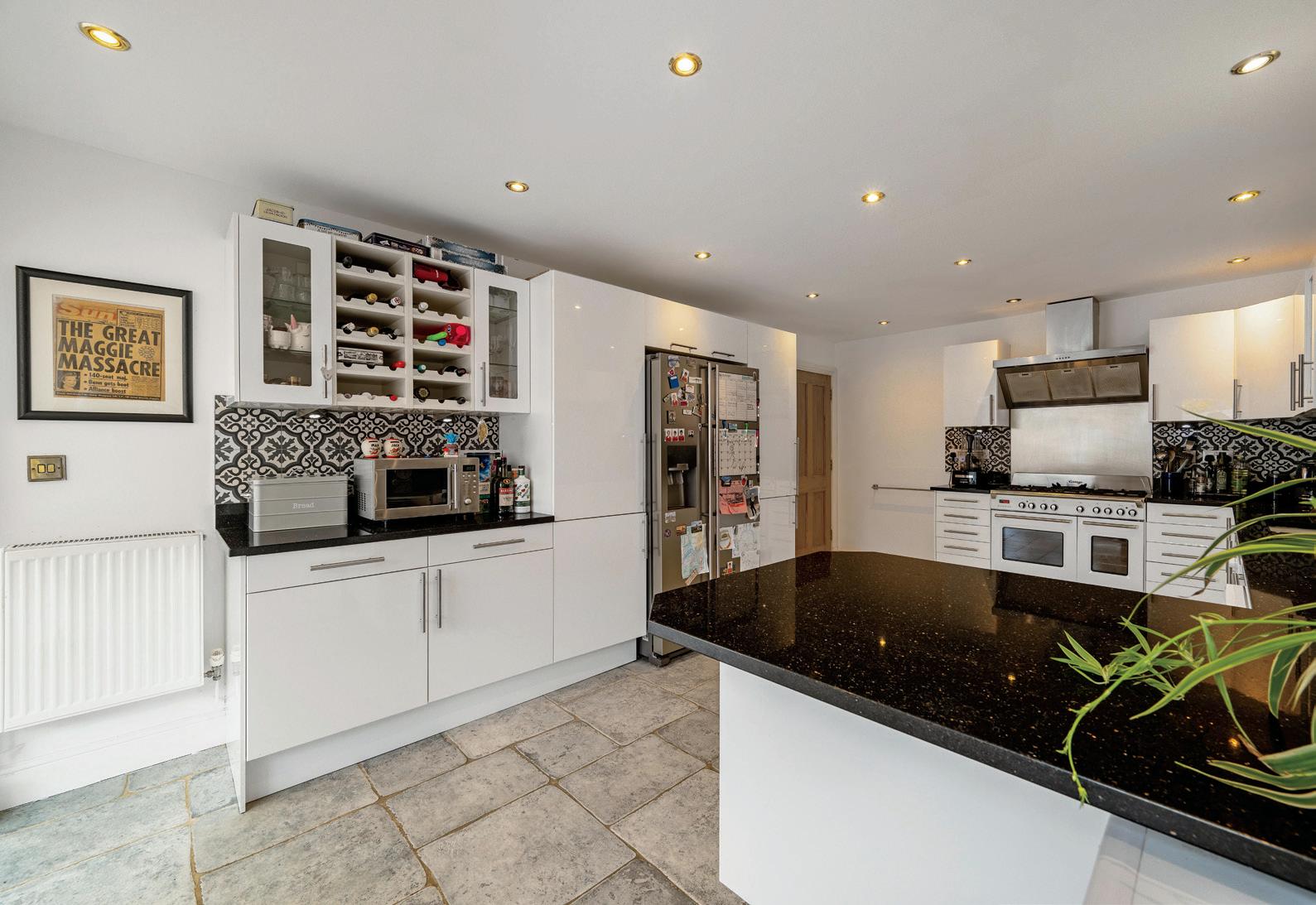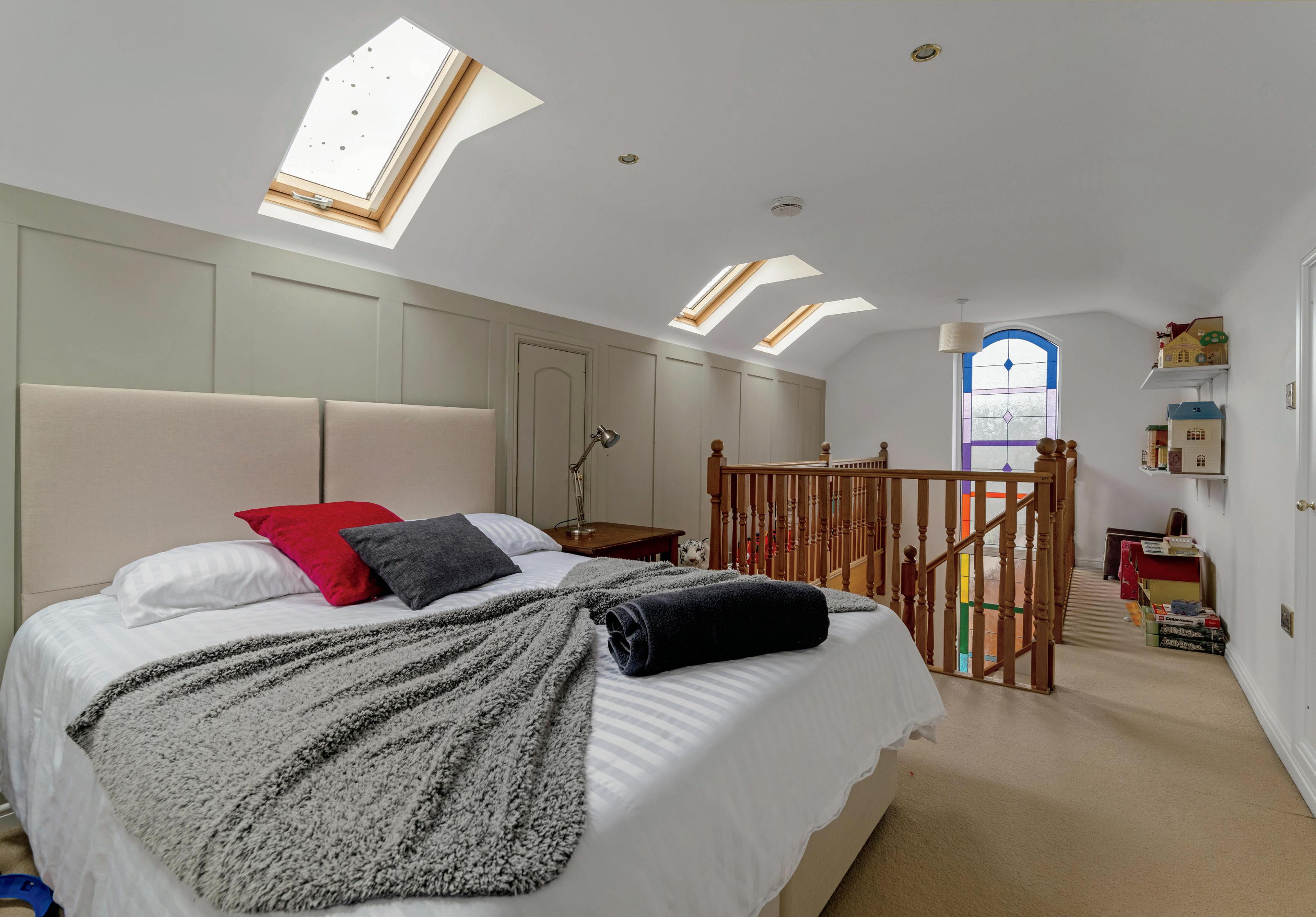 A further staircase leads to the second floor which is currently used as a guest bedroom suite where there’s plenty of storage in the eaves, and Velux roof windows providing plenty of natural light.