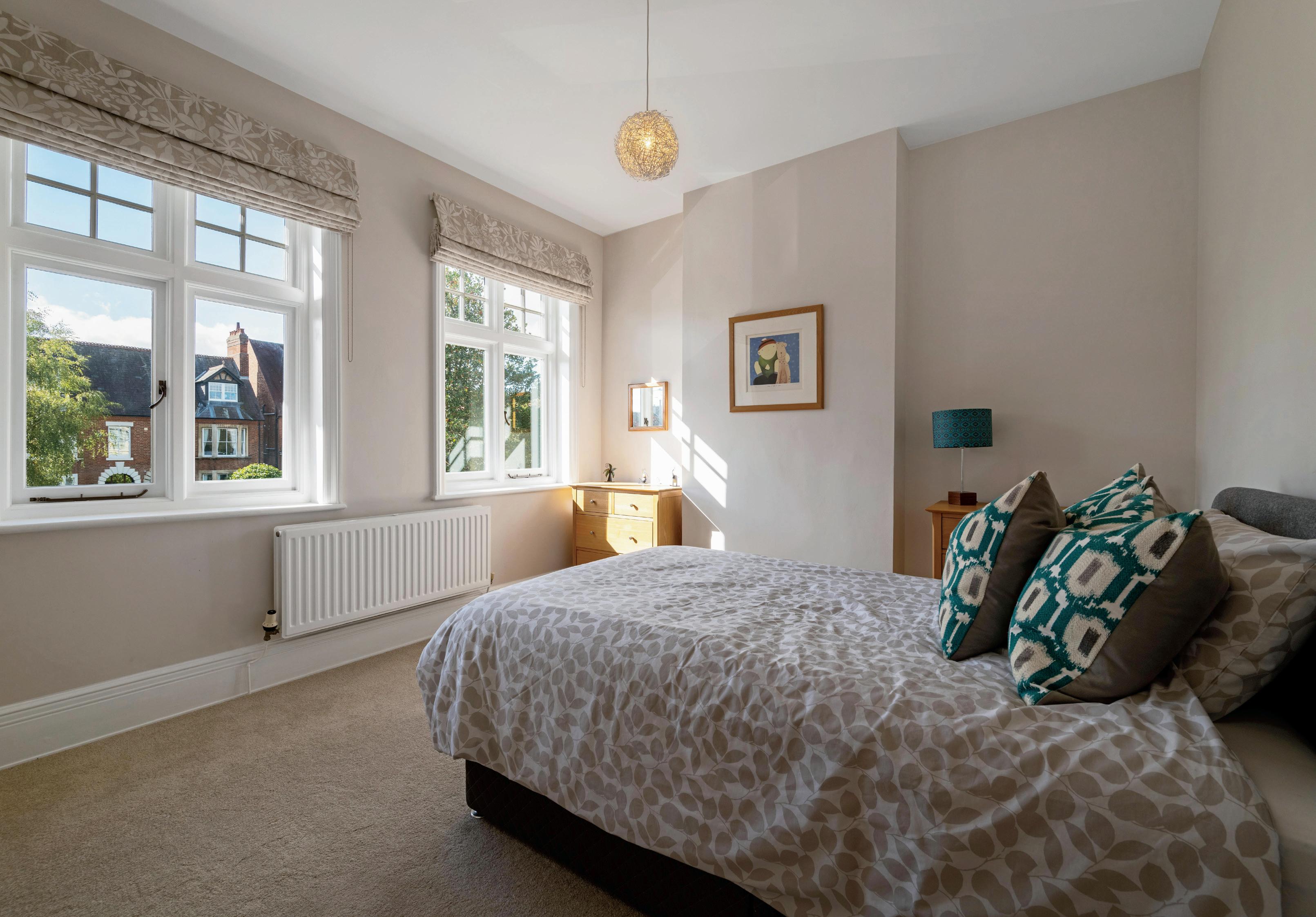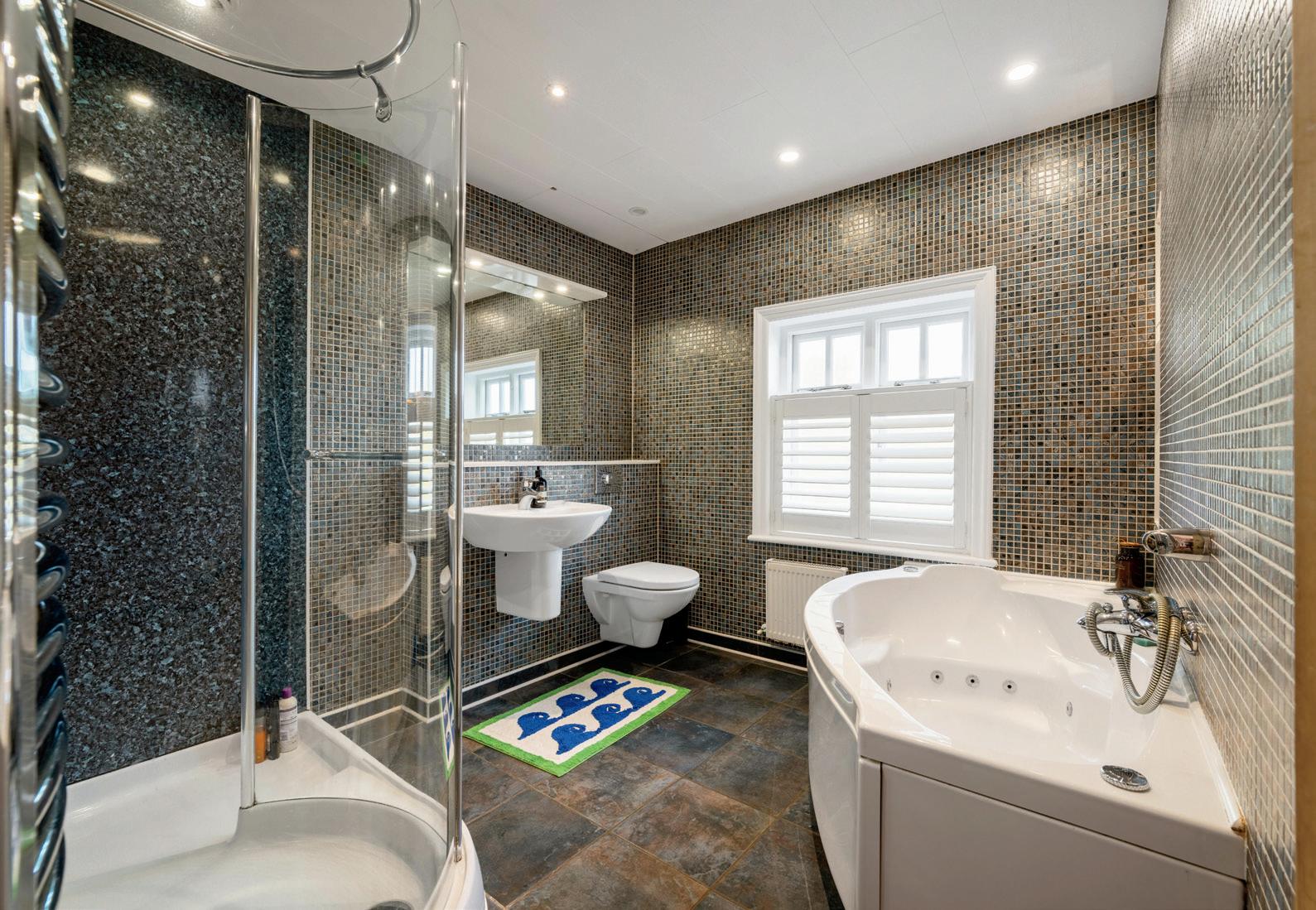 On the half landing there is an attractive, large, original leaded glazed window, with coloured glass and access to a first floor WC, with a low-level WC wash basin and window to the front. The landing provides access to 4 double bedrooms with the principal bedroom offering a large bay window, bathed in natural light, original ceiling cornicing and a picture rail, an original cast iron fireplace, a complementary sink and deep sectional skirting boards. Bedroom two is another large double room with rear views, bespoke shutters, another original fireplace, wash basin and two opaque double glaze windows to the side aspect. Bedroom three enjoys views of the frontage with two double glaze windows, whilst bedroom four has views of the garden and rear extension and bespoke privacy shutters, currently used as the family gym. The family bathroom is just off the secondary staircase and is fitted with a four-piece suite, including whirlpool bath, enclosed WC, wash basin with mosaic tiled splashback and a corner shower cubicle with shower screen and heated chrome towel rail, together with a double-glazed window to the rear with additional bespoke privacy shutters.