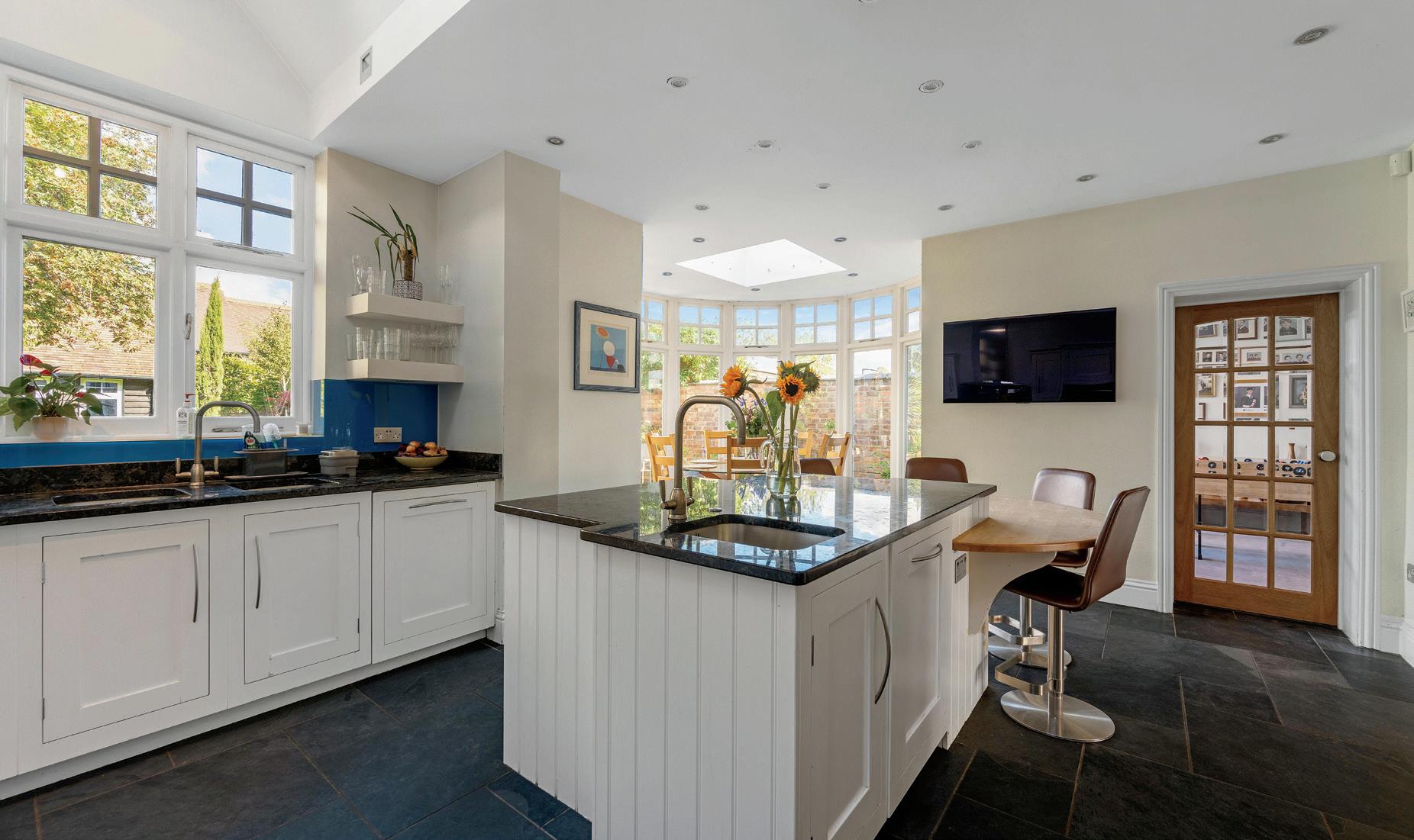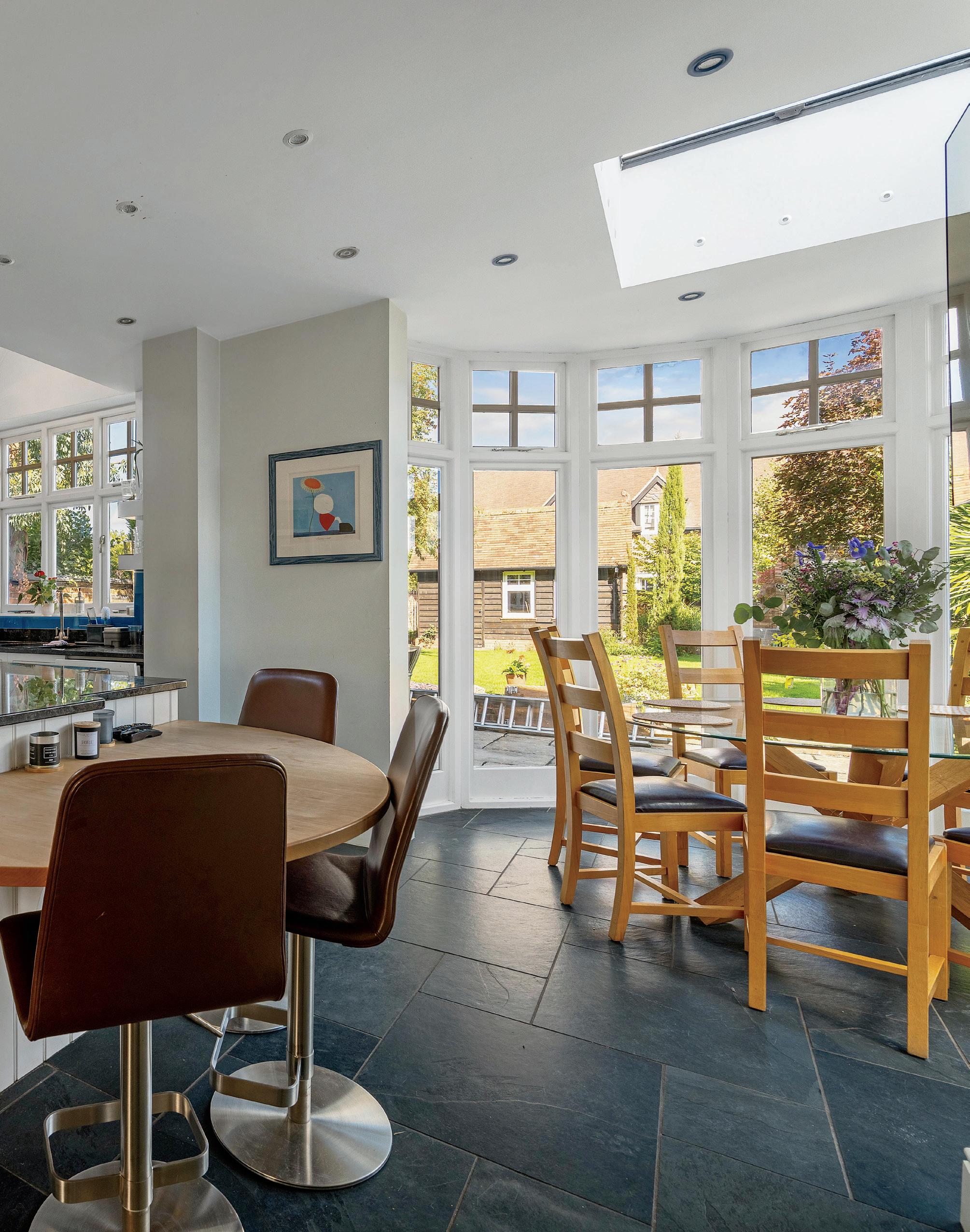 The house has been cleverly extended by an inspirational local architect, sympathetic to the building’s origins but synonymous with modern living, with a large kitchen/dining room at the rear of the house. There’s plenty of built-in storage centred around a tiled floor and access to a utility room at the side of the property, which has a door leading to the side access and a window overlooking the rear gardens, space and plumbing for a washing machine and tumble dryer and a wall mounted central heating boiler. The kitchen area itself has been fitted with a range of bespoke timber, white painted units with adjoining granite works surfaces. There’s an island unit with a breakfast bar that could accommodate four people for casual dining, two sinks set beneath the window overlooking the garden and a further sink on the island unit. There’s a fine range of built-in appliances including three ovens, a warming drawer, four-ring Neff induction hob and a singular gas hob suitable for wok cooking, with extractor hood above. There is also an integrated Miele dishwasher. The kitchen area has vaulted ceiling with a range of Velux roof windows and to compliment this, is an attractive dining area with semicircular windows, providing attractive views of the rear gardens. Above is a glazed canopy with feature lighting, perfect for evening entertaining.